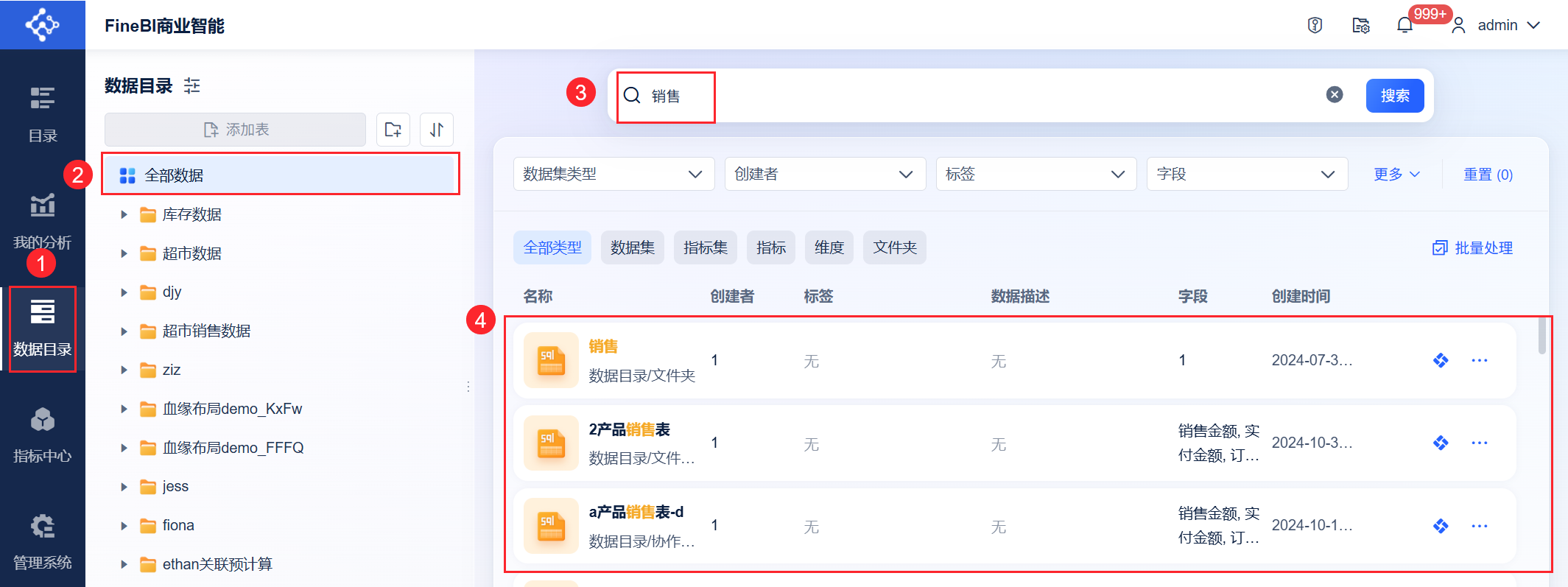 数据目录中的搜索,能直接搜索到资产描述信息,如字段、备注,可以展示业务口径、加工逻辑等数据信息,支撑业务分析人员快速查找和使用。