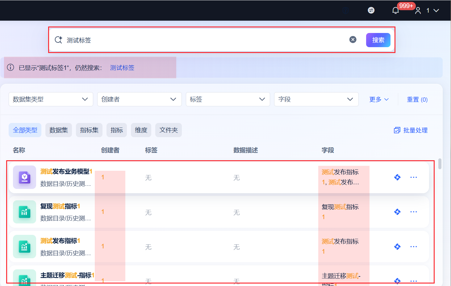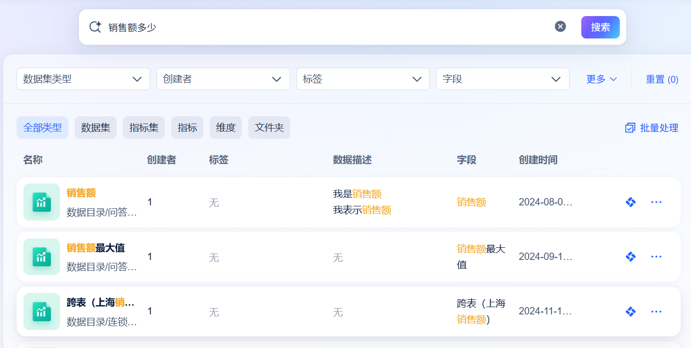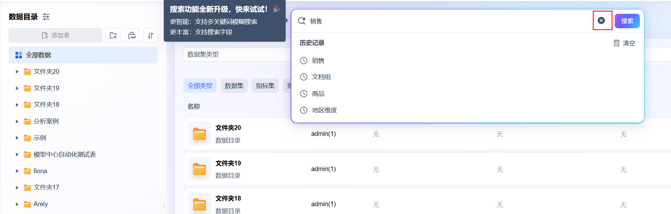 开启「搜索增强>高级搜索」后,增加了更多筛选条件,可以根据数据类型、标签、数据权限、创建者进行筛选,还支持多关键词模糊搜索,获得更精准的数据推荐。如下图所示: