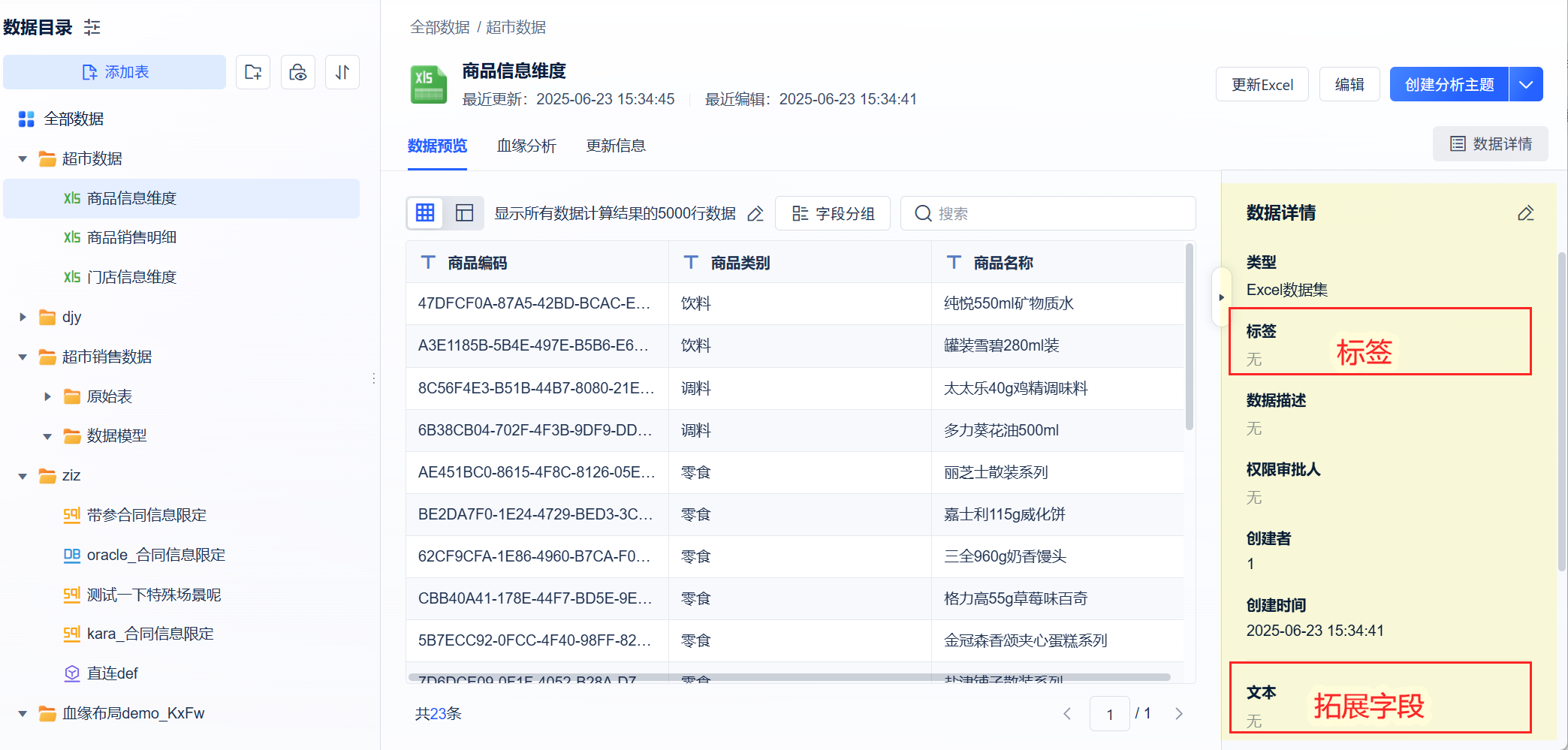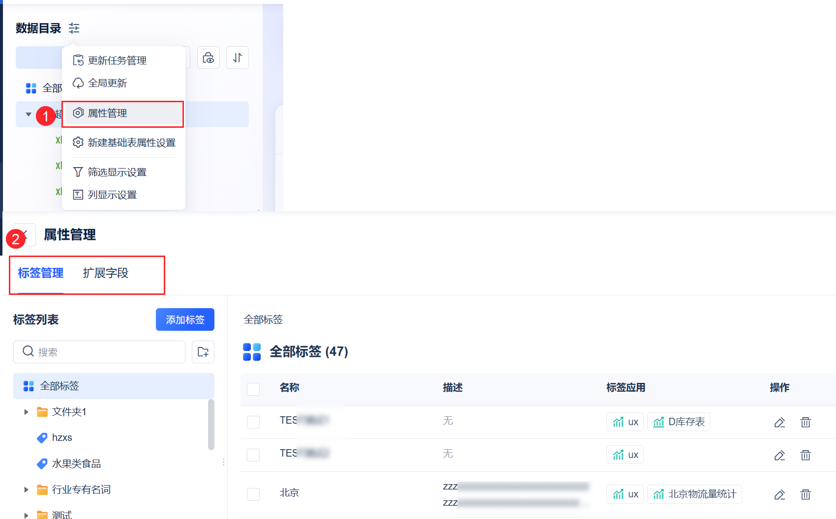在「数据目录」点击「属性设置」可对数据的标签和扩展字段。如下图所示: