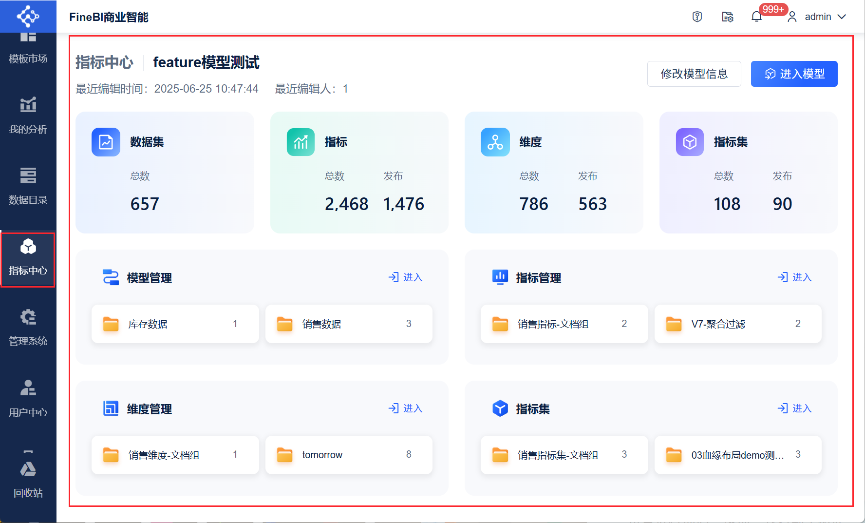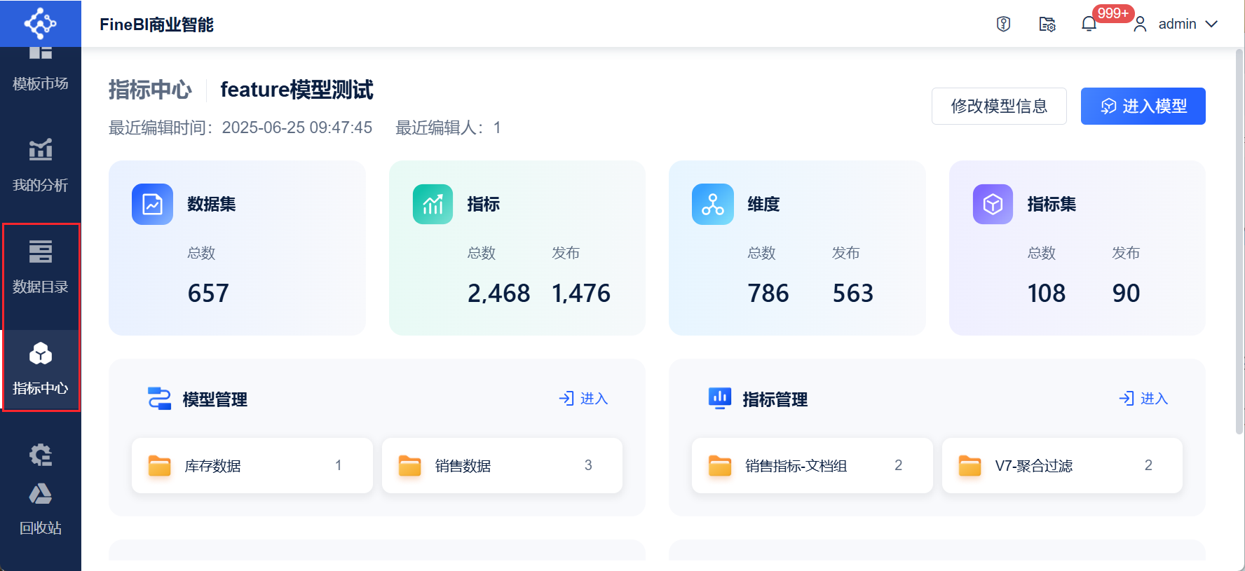 1)「模型中心」改名为「指标中心」。删除「数据中心」节点,将「数据目录」和「指标中心」作为一级菜单。