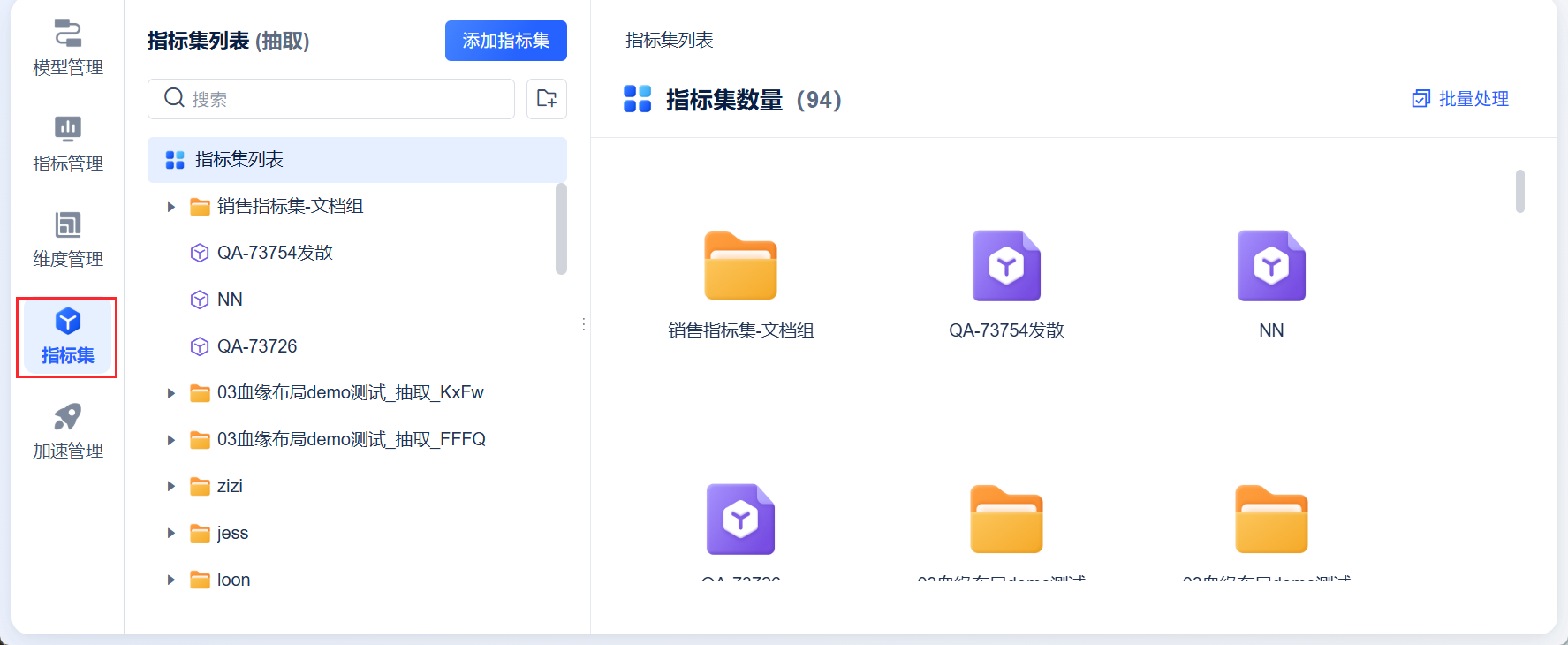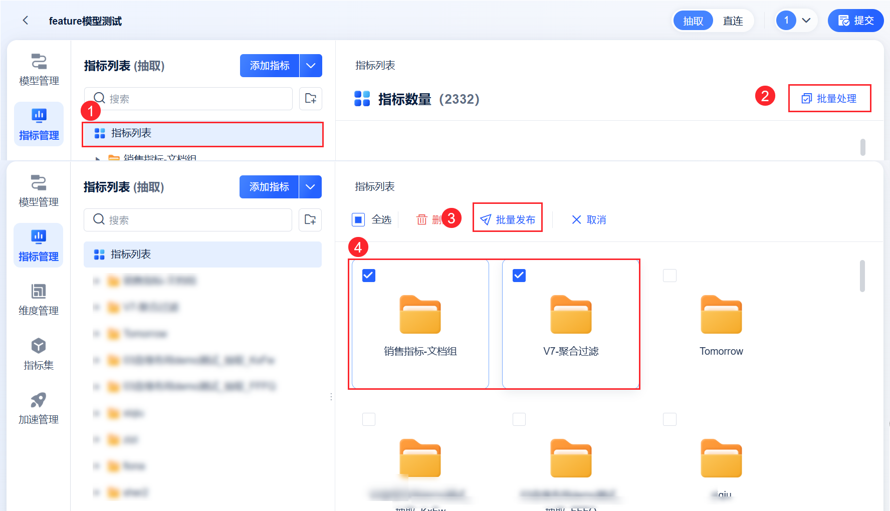 选择「指标列表」或者列表下文件夹即可在右侧进行「批量处理」,选中要发布的内容后点击「批量发布」,如下图所示: