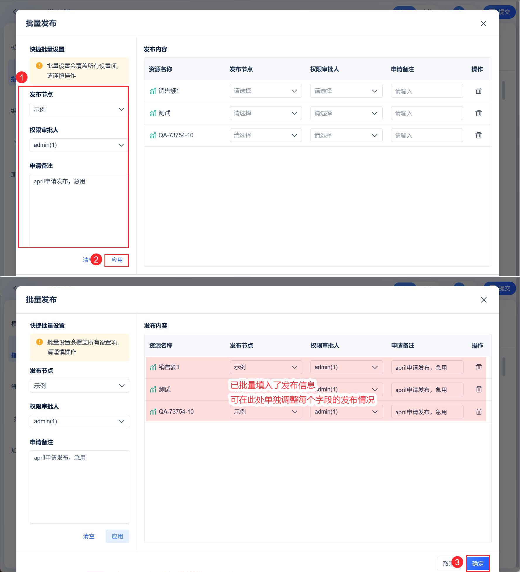 在左侧可以进行快捷批量设置并「应用」,然后再右侧调整每条发布内容之后,点击「确定」,即可批量发布。如下图所示: