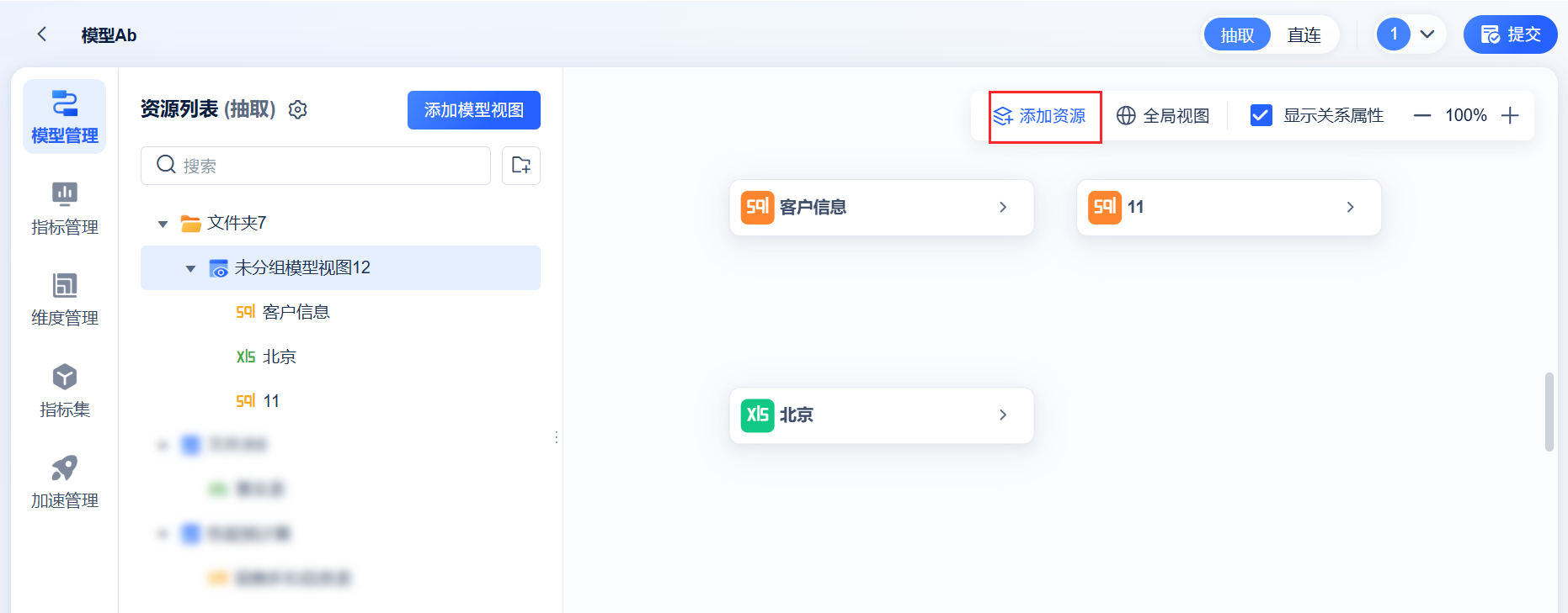 2)原「添加资源」入口变成「添加模型视图」,添加模型视图的同时可以添加数据资源。如下图所示: