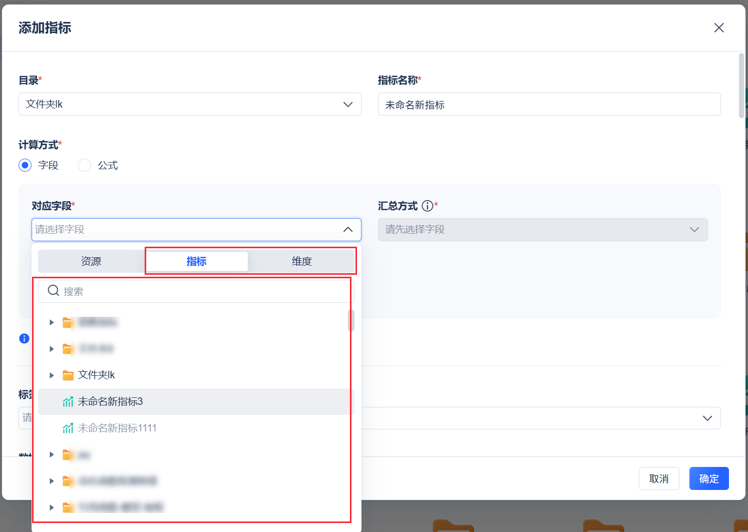 指标管理「添加指标」时,计算方式「字段」下,选择「对应字段」和添加「过滤条件」支持选择从指标管理和维度管理中添加的字段。如下图所示: