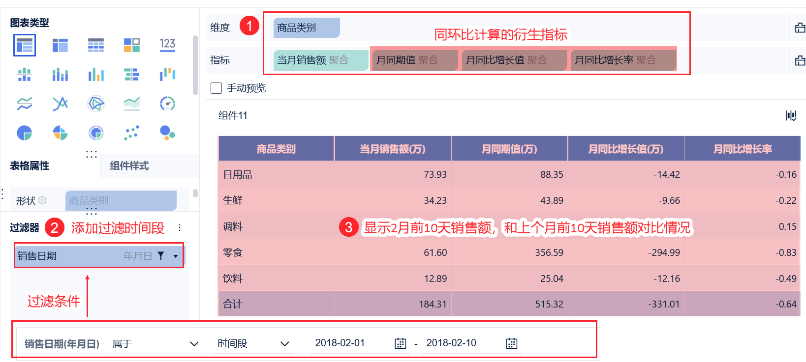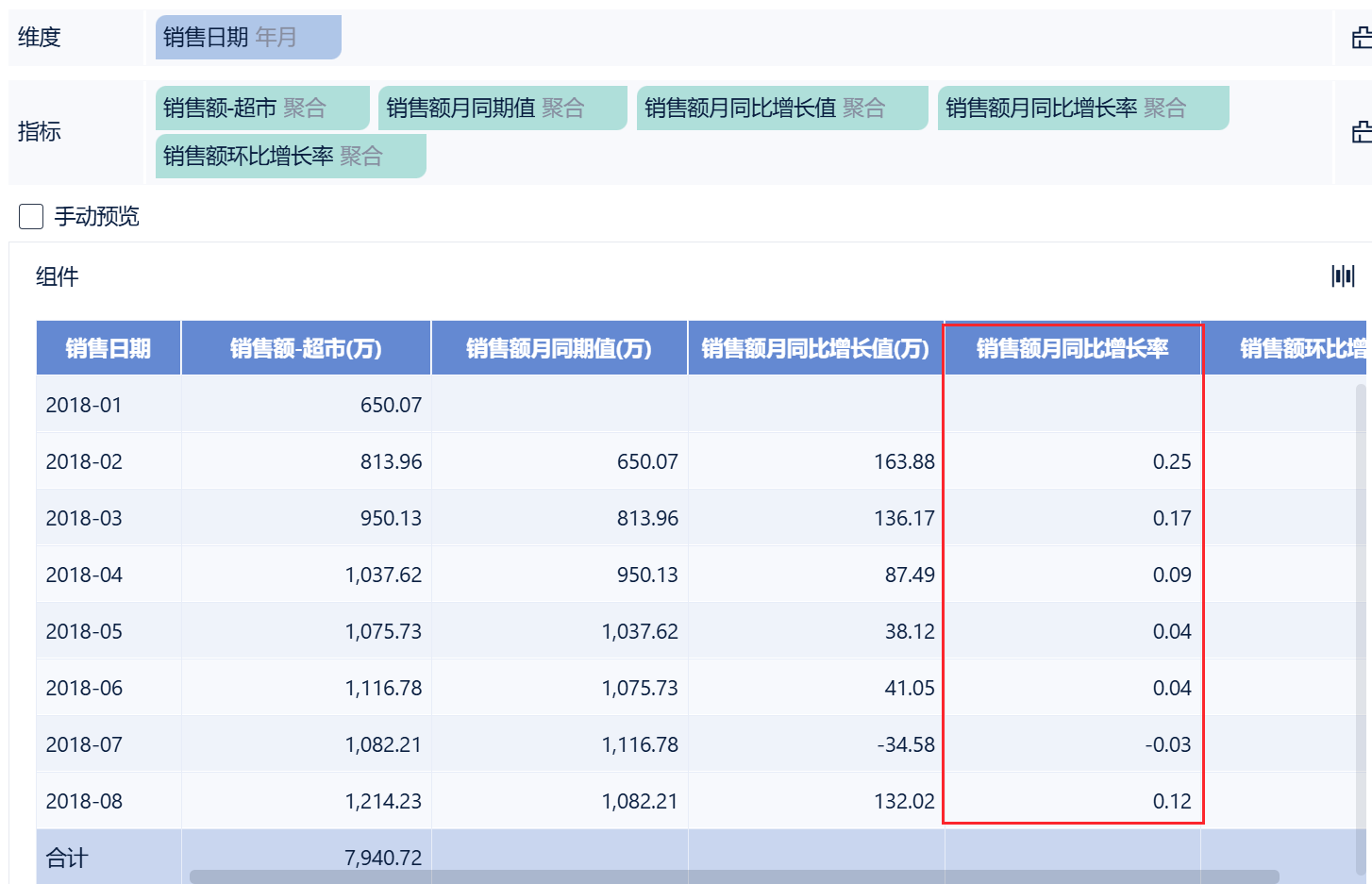 指标月同期/同比计算,组件有日期字段场景效果预览: