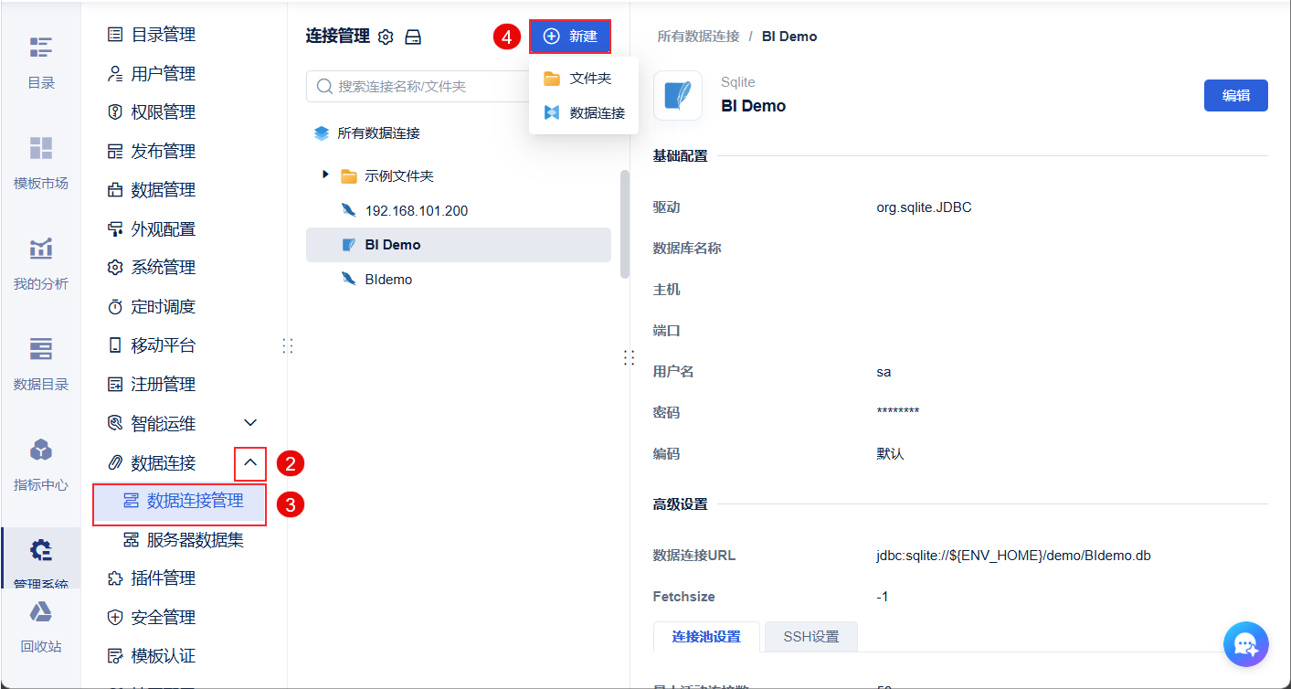 注:如果非管理员用户想要配置数据连接,需要管理员给其分配管理系统下数据连接节点的权限,具体操作请查看 数据连接权限