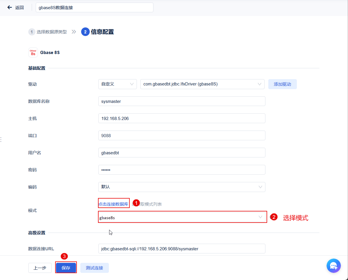 3)驱动切换为「自定义」选择 2.1 节上传的驱动,然后输入 2.2 节的连接信息。如下图所示:
