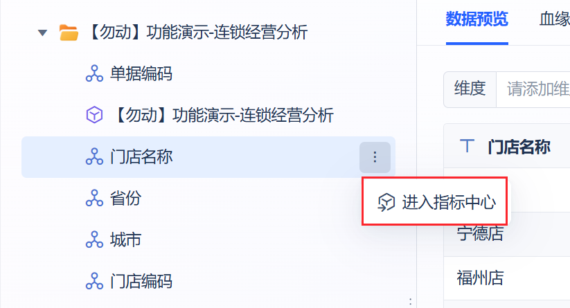 指标中心发布的指标/维度/指标集点击下拉,可快速进行「指标中心」进行编辑。如下图所示: