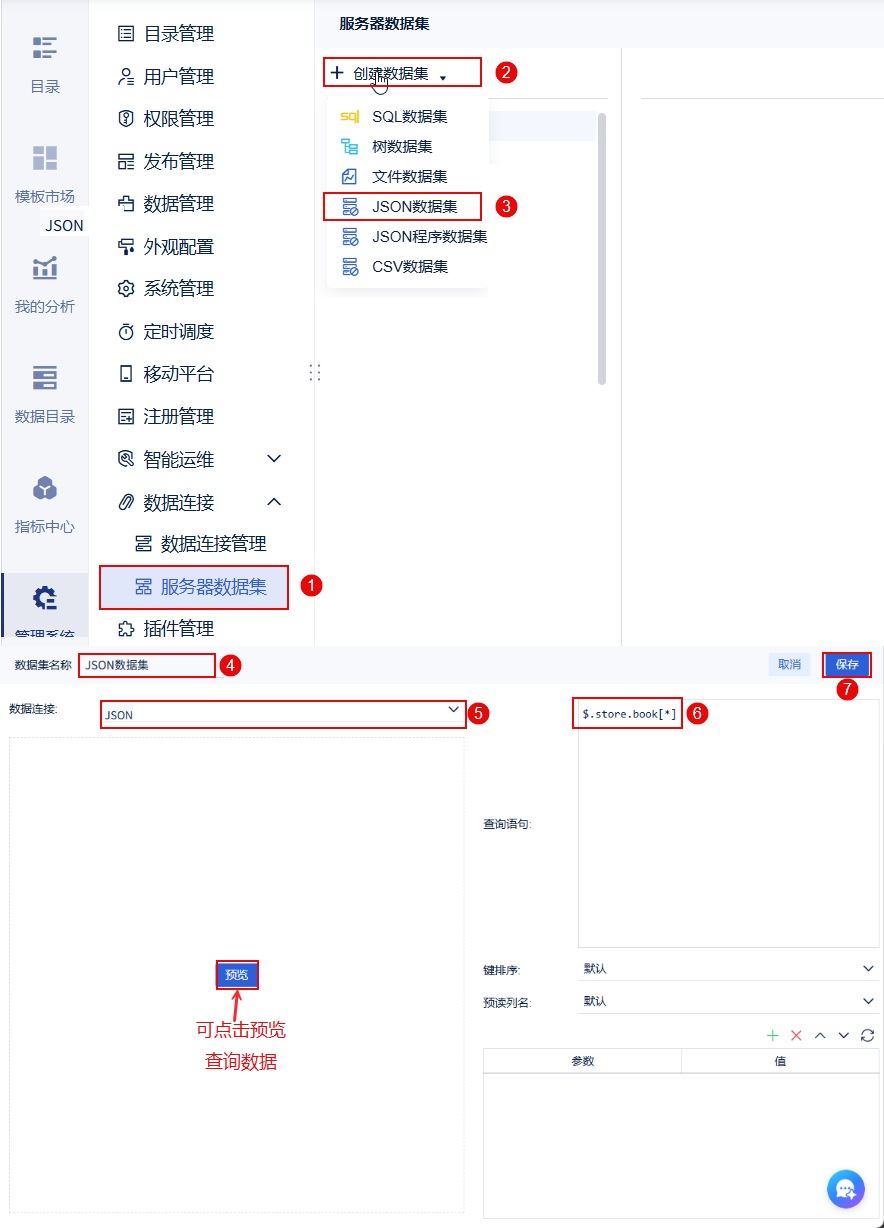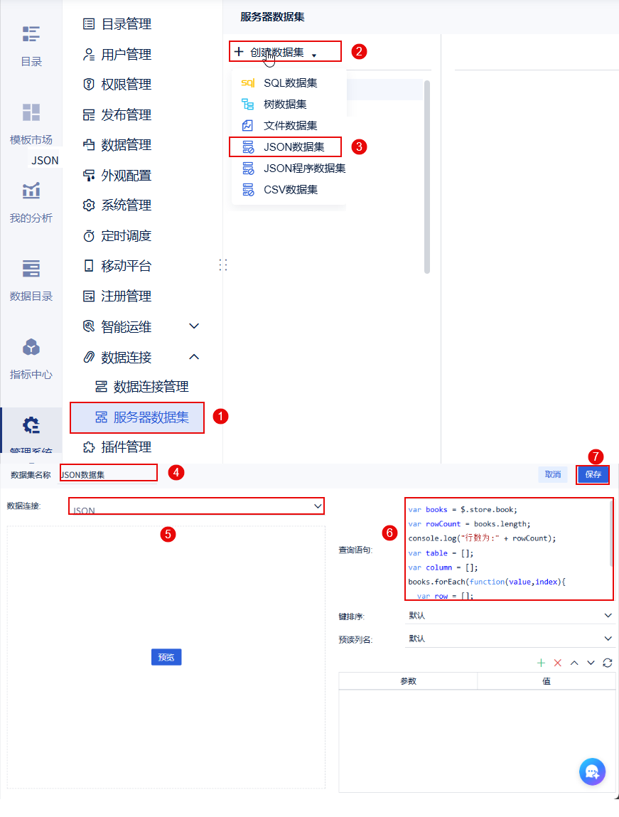以管理员身份进入数据决策系统,点击「管理系统>数据连接>服务器数据集>JSON程序数据集」,数据集名称为「JSON程序数据集」,选择创建的 JSON 数据连接,输入脚本语句,点击「保存」按钮即可。如下图所示: