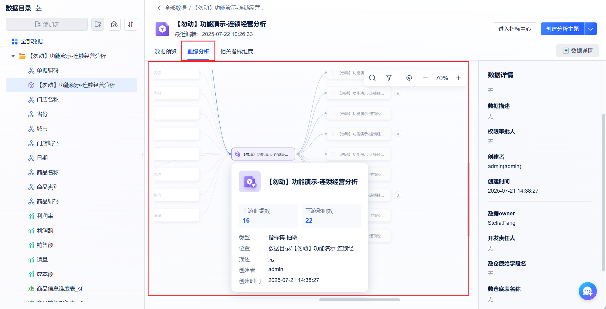 点击「血缘分析」可查看数据上下游节点的相关信息。详情请参见文档:血缘分析