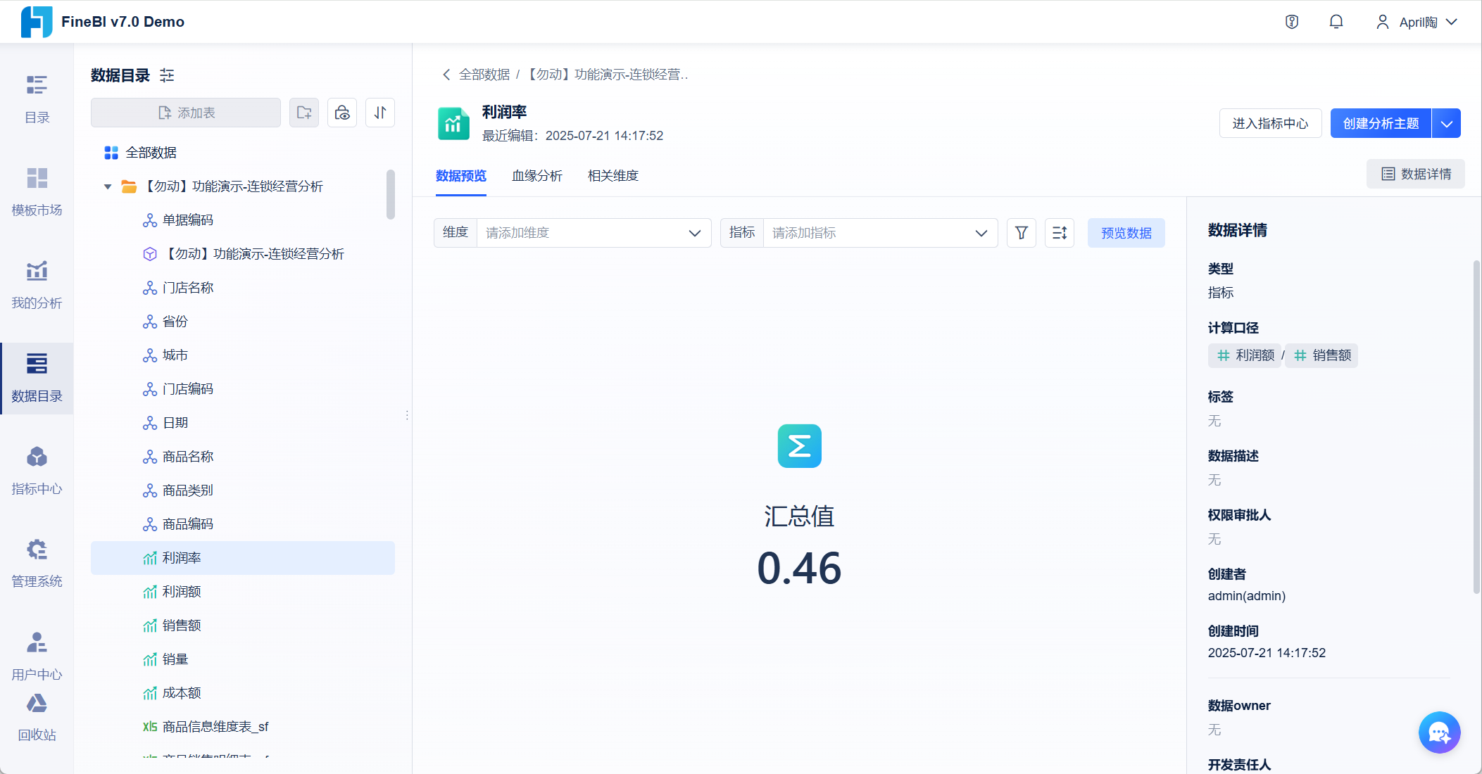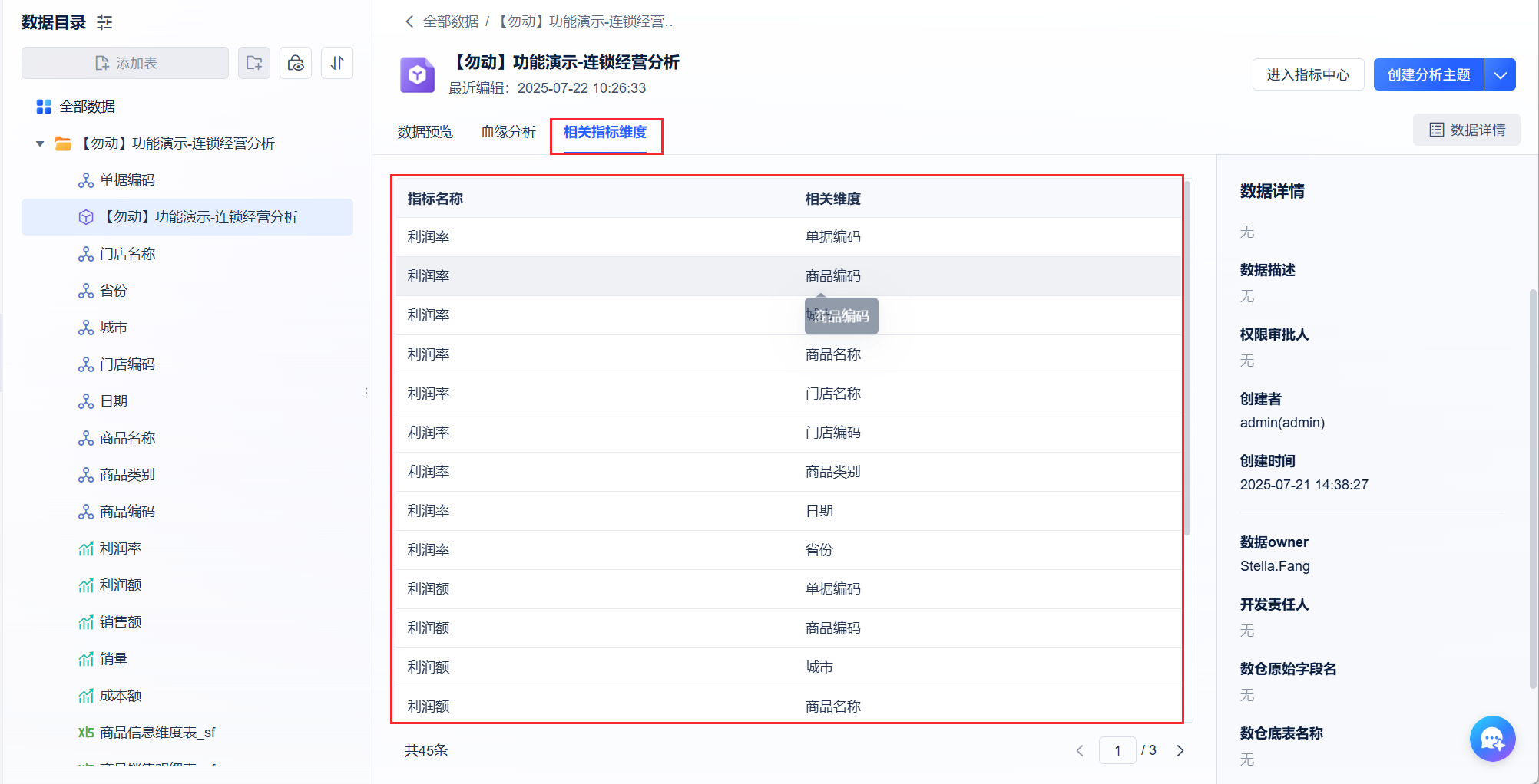指标中心输出的数据资源展示该节点,显示与其相关联的指标和维度信息。如下图所示: