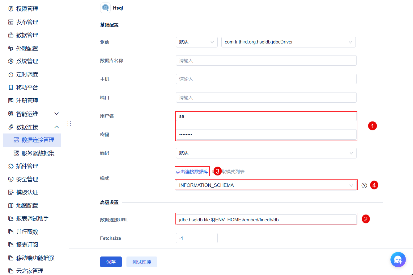比如内置数据库的存储在 %FineBI%\webapps\webroot\WEB-INF\embed\finedb\db 下 ,那么我的数据连接URL就填写