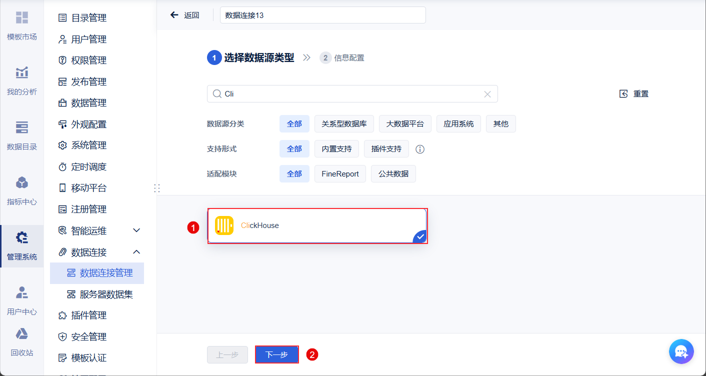注:如果非管理员用户想要配置数据连接,需要管理员给其分配管理系统下数据连接节点的权限,具体操作请查看 数据连接权限