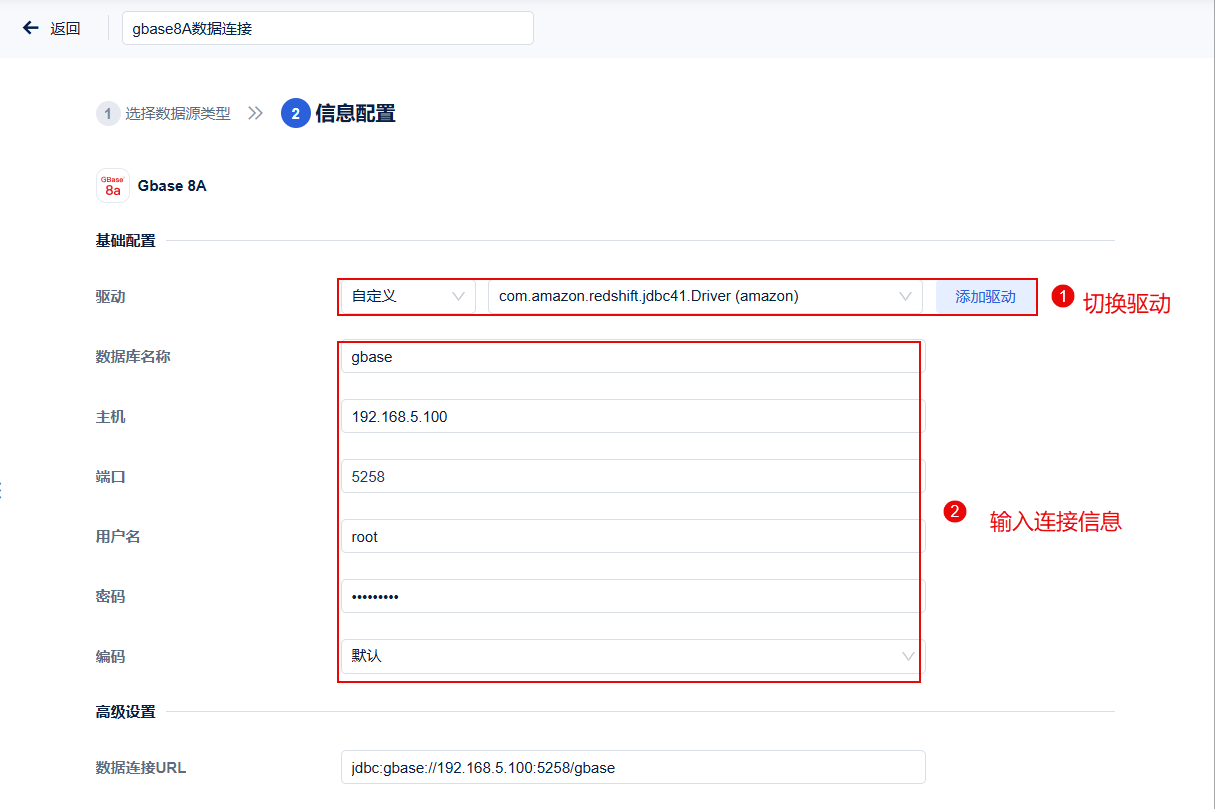 3)驱动切换为「自定义」选择 2.1 节上传的驱动,然后输入 2.2 节的连接信息。如下图所示: