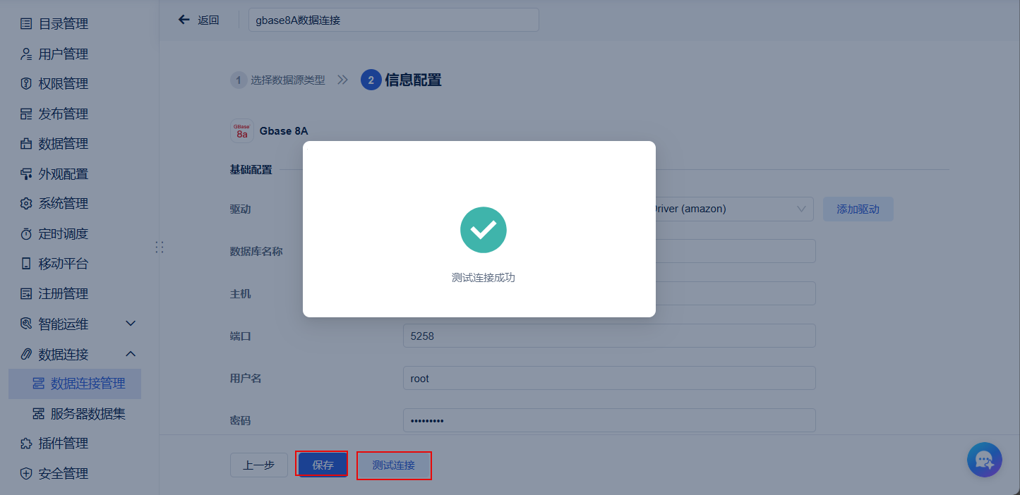 4)点击「测试连接」,若连接成功则点击「保存」。如下图所示: