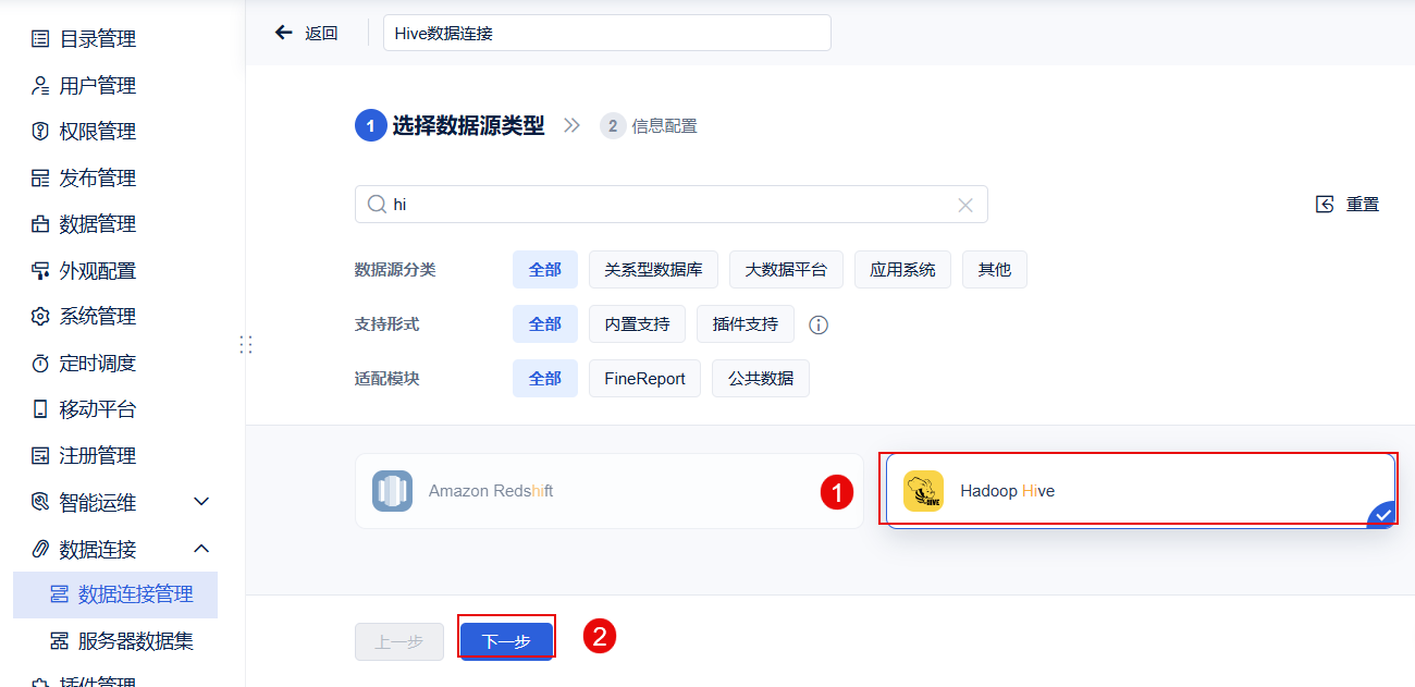 注:如果非管理员用户想要配置数据连接,需要管理员给其分配管理系统下数据连接节点的权限,具体操作请查看 数据连接权限