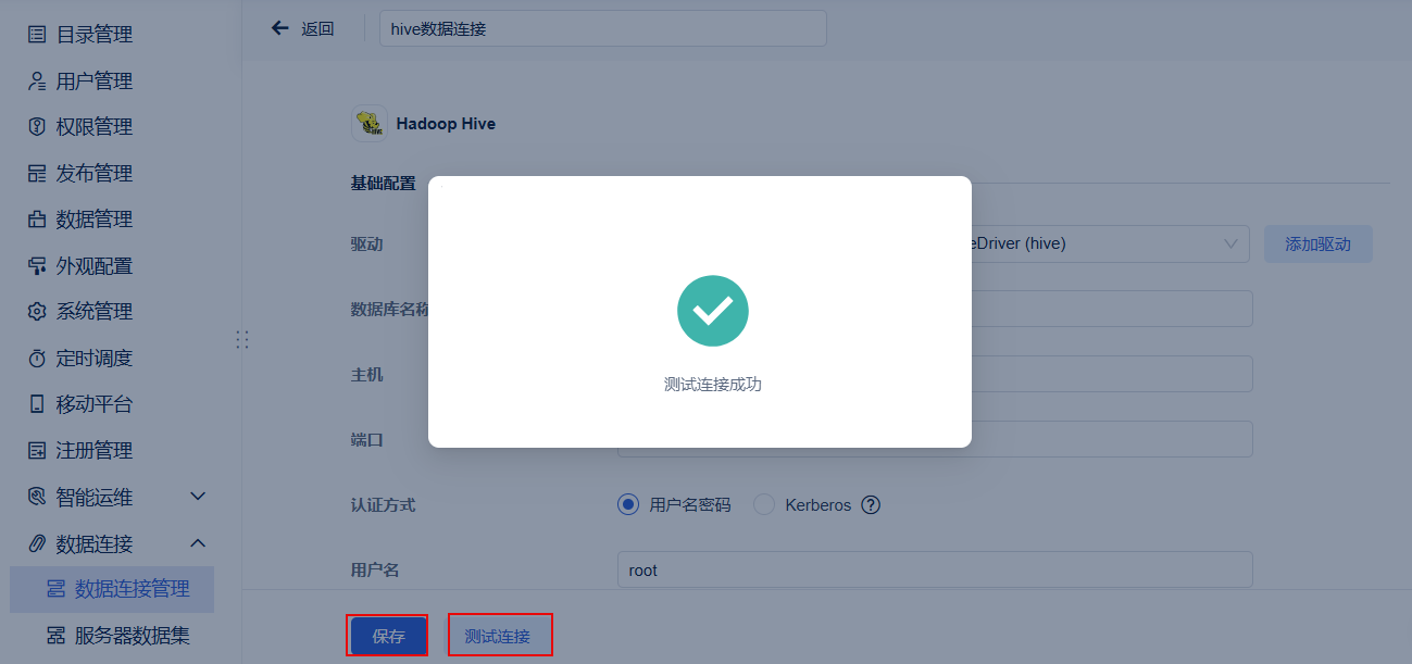 4)点击「测试连接」,若连接成功则点击「保存」,如下图所示: