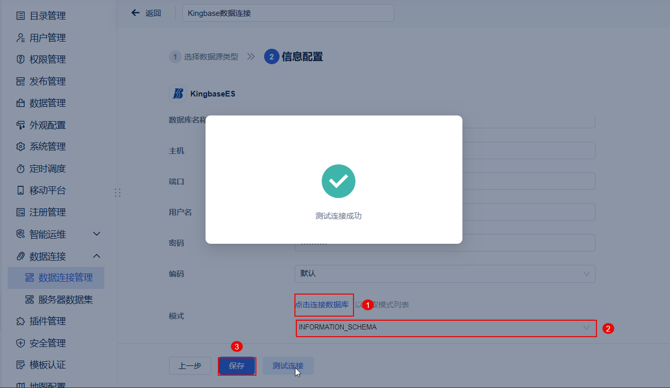 4)点击「点击连接数据库」,成功后便可选择需要使用的模式(若不选择则默认使用第一个),最后保存该数据连接,如下图所示: