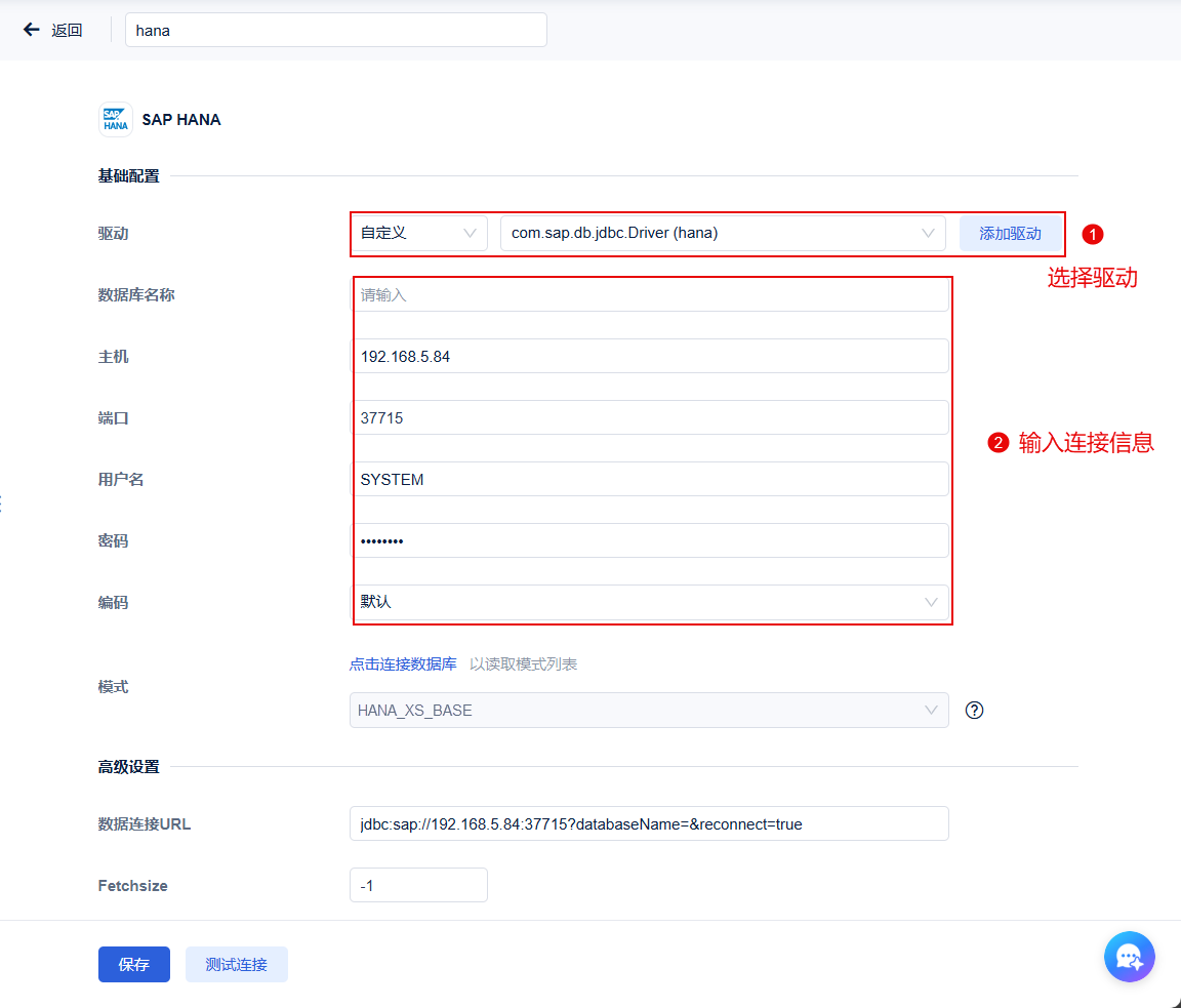 3)驱动切换为「自定义」选择 2.1 节上传的驱动,然后输入 2.2 节的连接信息。如下图所示: