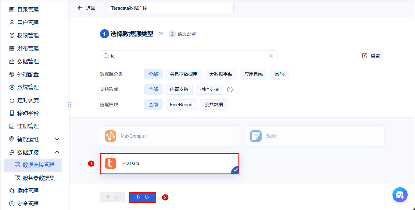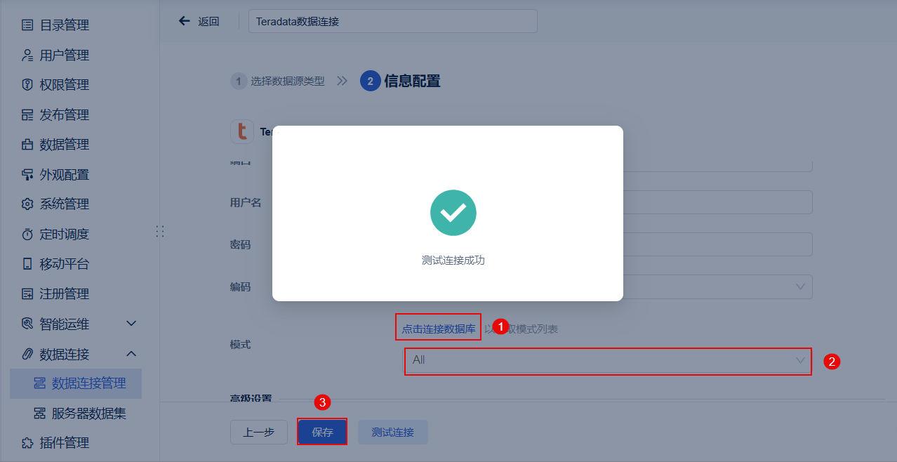注:如果非管理员用户想要配置数据连接,需要管理员给其分配管理系统下数据连接节点的权限,具体操作请查看 数据连接权限