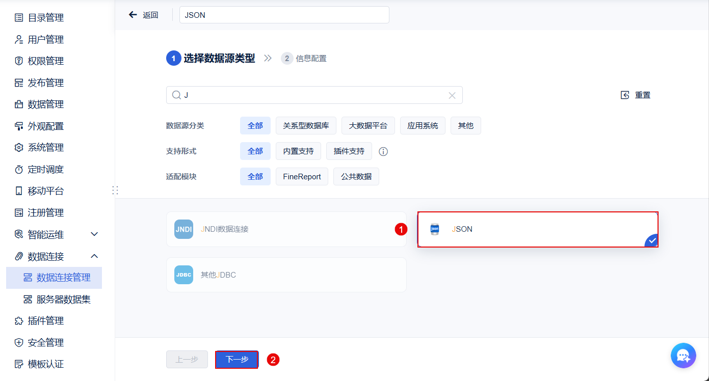1)以管理员身份进入数据决策系统,点击「管理系统>数据连接>数据连接管理>新建数据连接>所有」,可添加 JSON 数据连接,如下图所示: