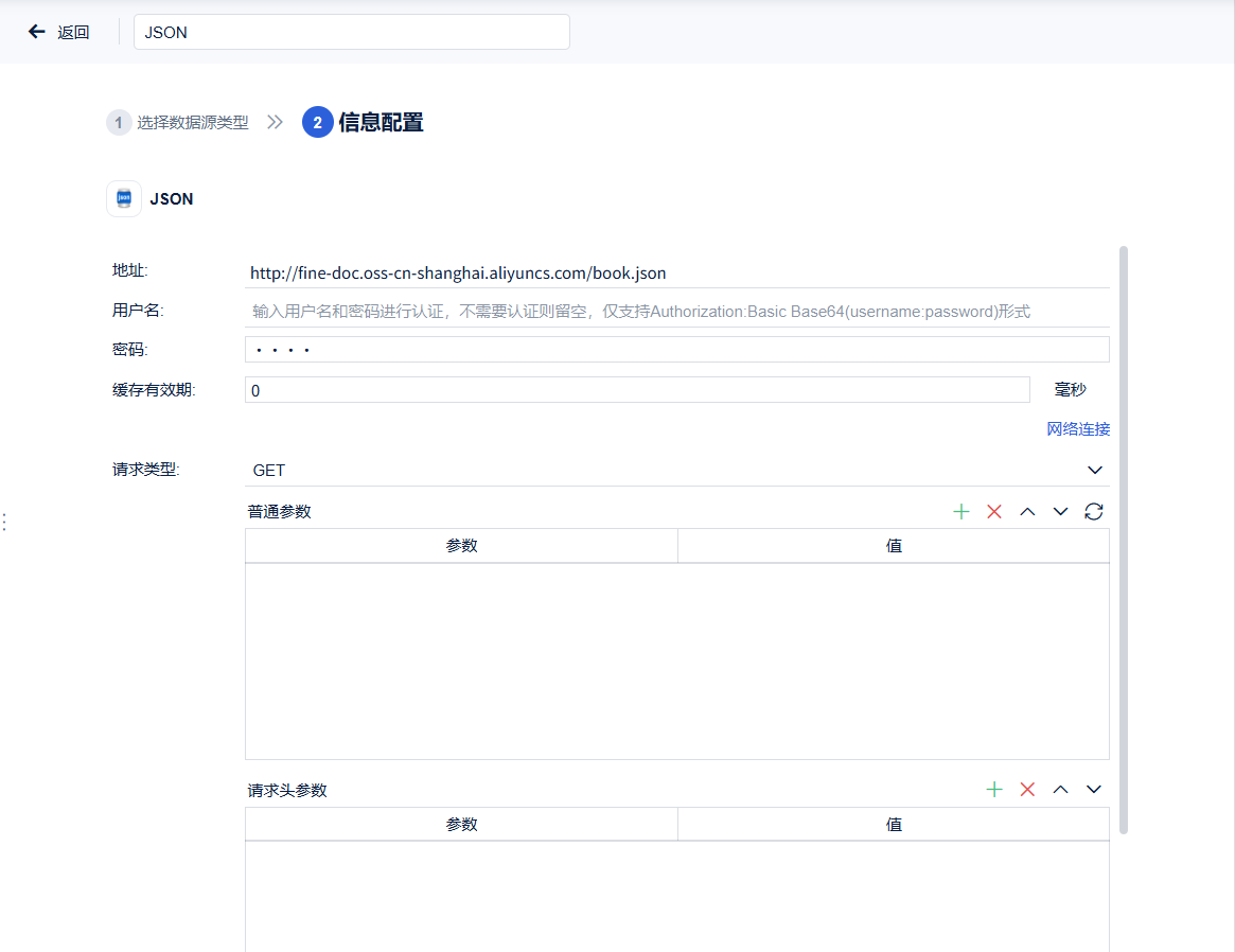 2)点击「JSON」,配置JSON数据连接。如下图所示:
