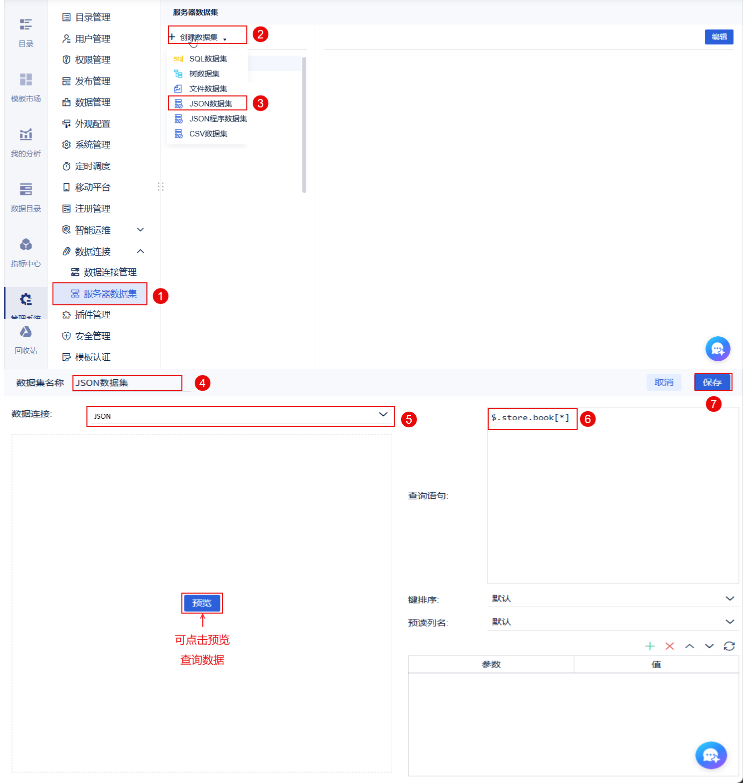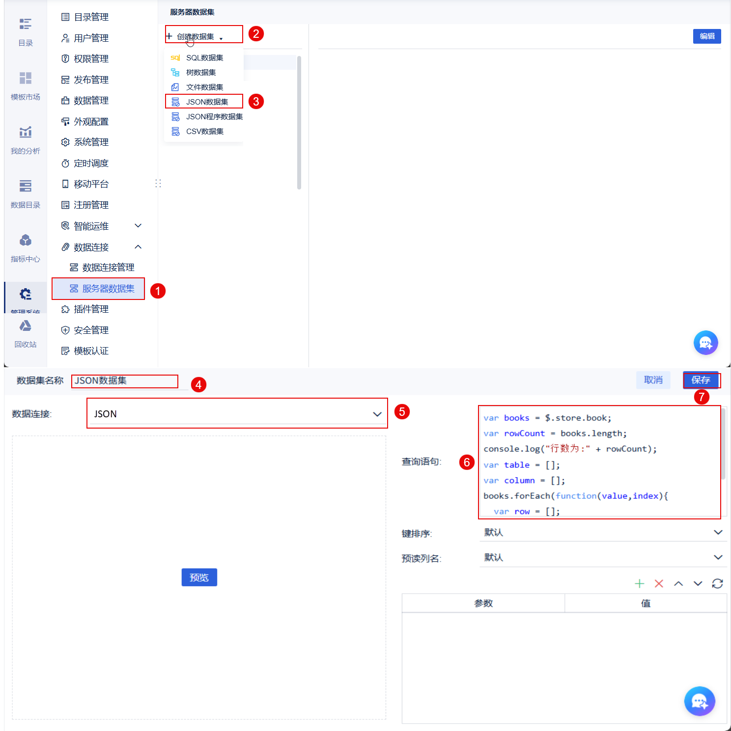 以管理员身份进入数据决策系统,点击「管理系统>数据连接>服务器数据集>JSON程序数据集」,数据集名称为「JSON程序数据集」,选择创建的 JSON 数据连接,输入脚本语句,点击「保存」按钮即可。如下图所示: