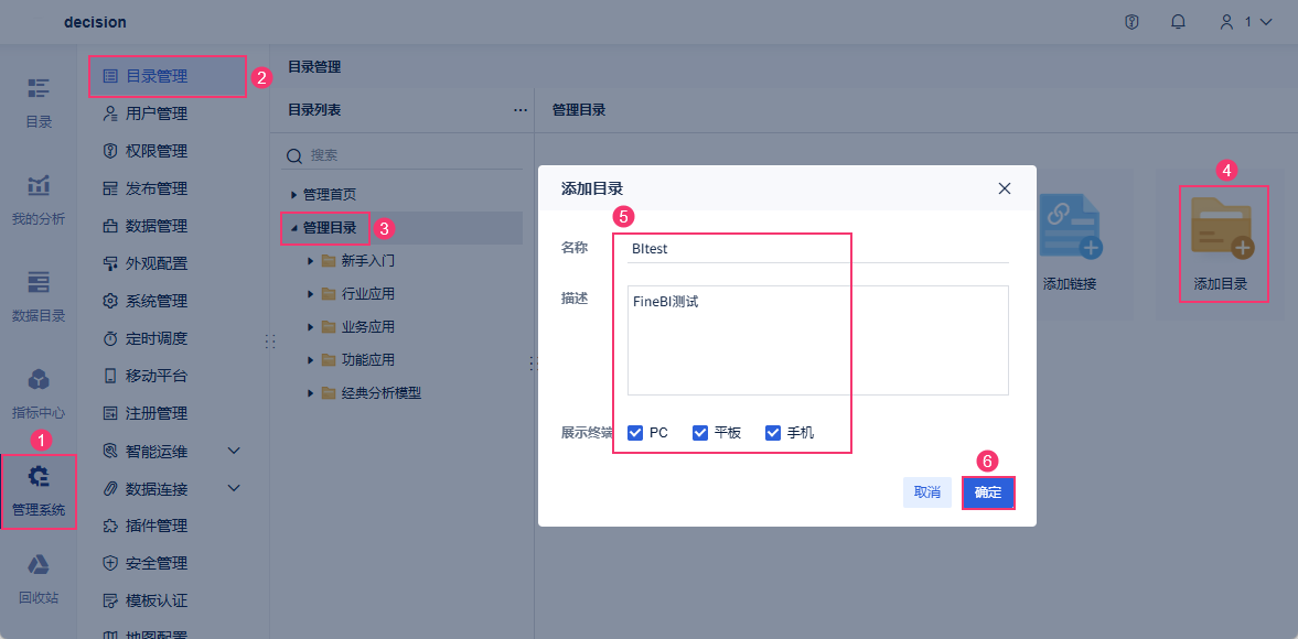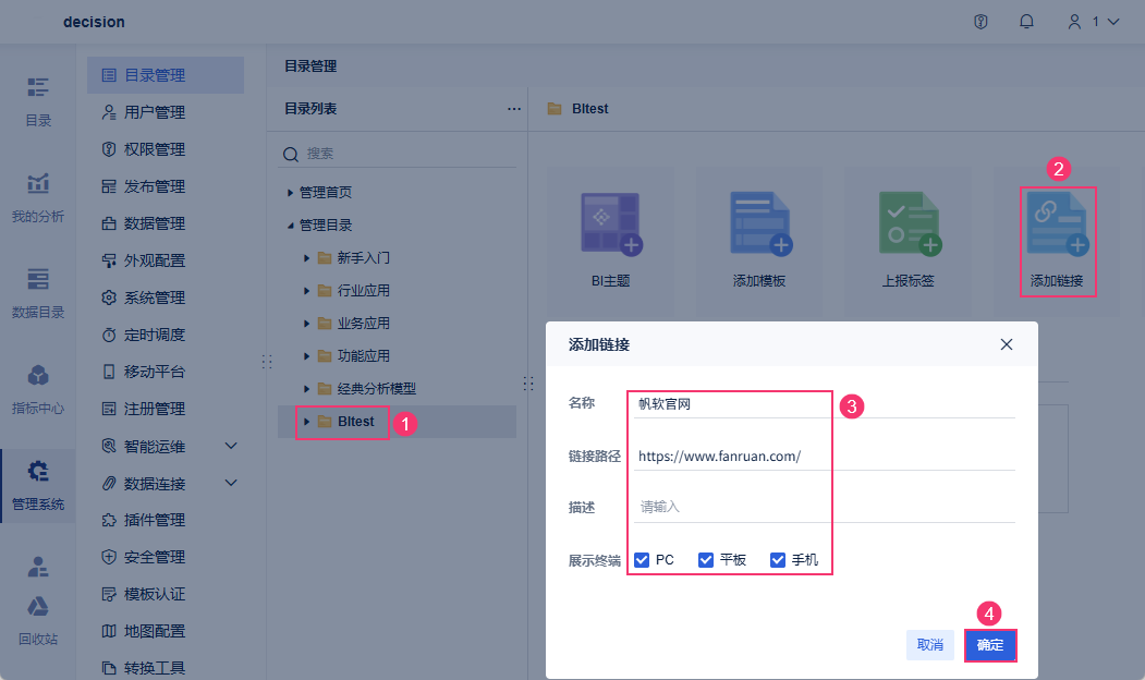 管理员可进行目录的增删改操作,可添加「BI主题、模板、上报标签、链接、目录」,本文将详细介绍。