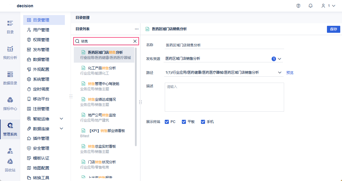 选中目录BItest ,右侧可以直接修改该目录的名称、描述、展示终端等设置,点击「保存」即可。如下图所示: