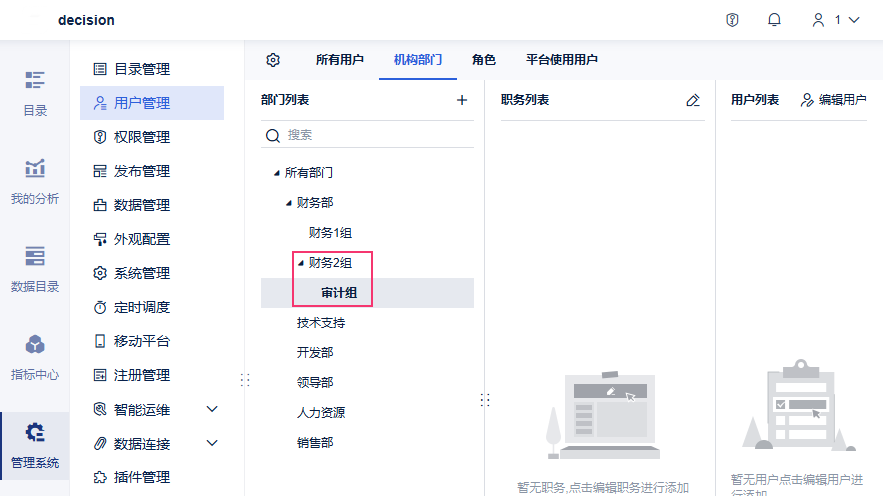 审计组就调整为了财务2组的下级部门。部门下的职务和用户也一起调整移动。