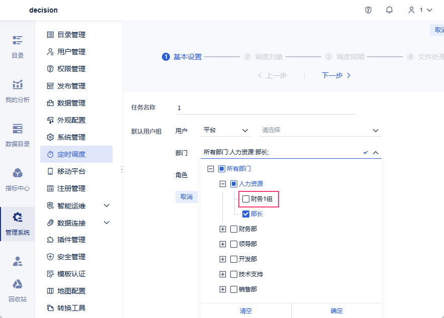 那么定时调度任务的默认用户组为「人力资源」下除了「财务1组」以外的其他部门和职务。