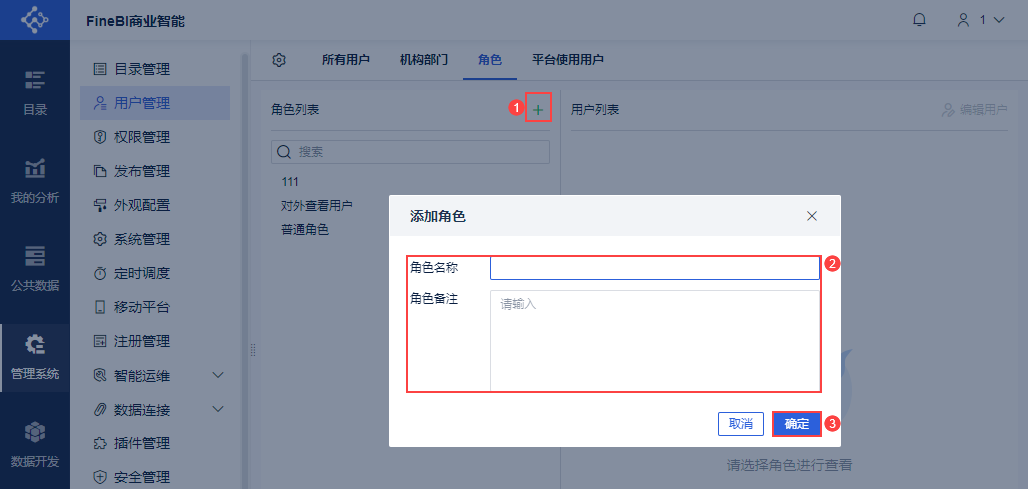 注:「PC 端使用用户」、「BI 使用用户」、「移动端使用用户」在添加对应用户时,步骤相同,本章以为「PC 端使用用户」添加对应用户为例。