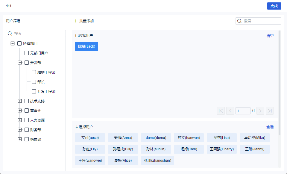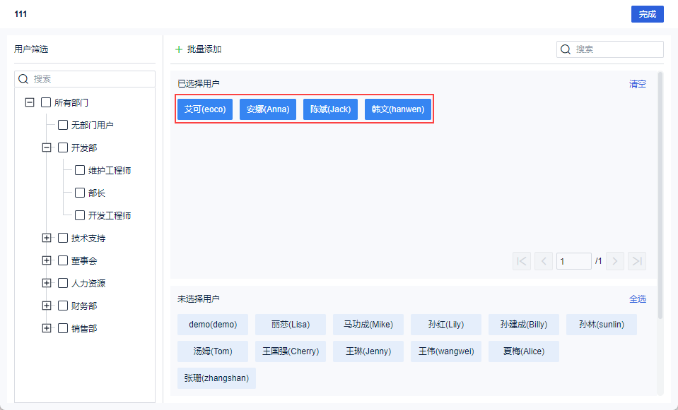管理员可对部门下的用户进行增减,支持一键全选,一键清空,如下图所示: