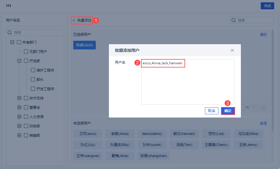 点击「批量添加」按钮,在弹出框中输入用户名,每个用户名之间用「,」隔开,点击确定,如下图所示: