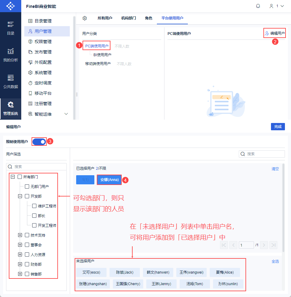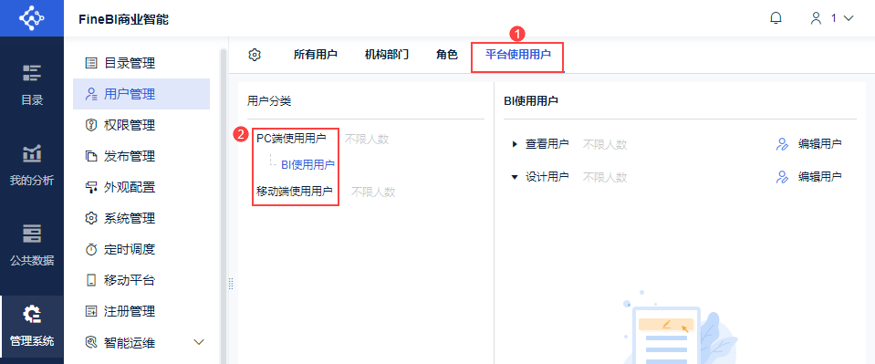 1)注册时,不限制用户数,则在平台使用用户中需要先开启「限制使用用户」再进行用户配置,否则默认所有的用户均有平台使用、BI 查看、BI 设计及移动平台权限。
