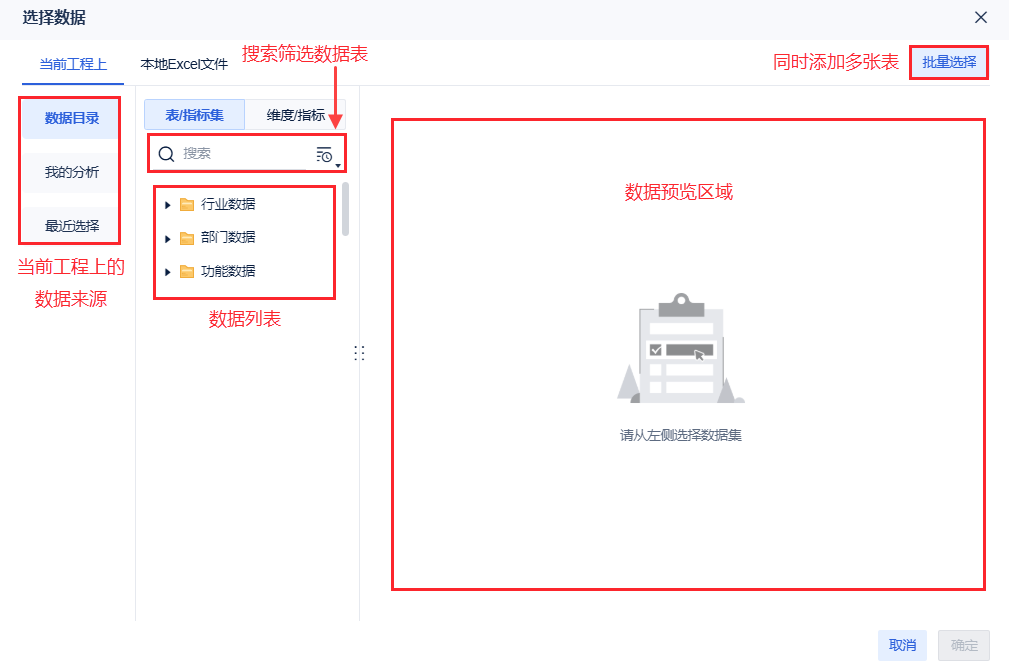 可以选择「数据目录」、「我的分析」、「最近选择」的数据。如下图所示: