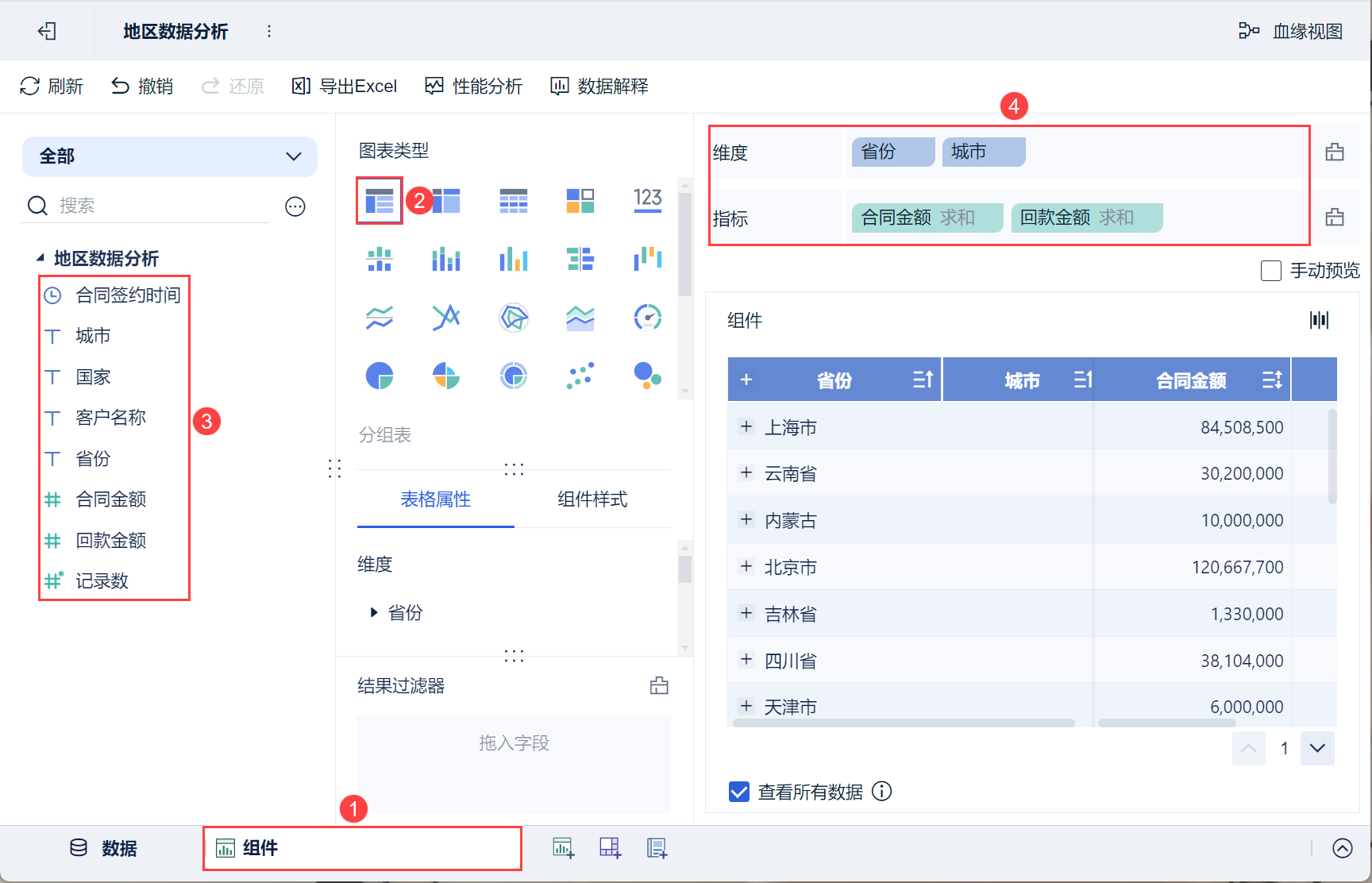 3)将待分析区域的「省份」「城市」拖入维度栏;「合同金额」「回款金额」拖入指标栏,如下图所示: