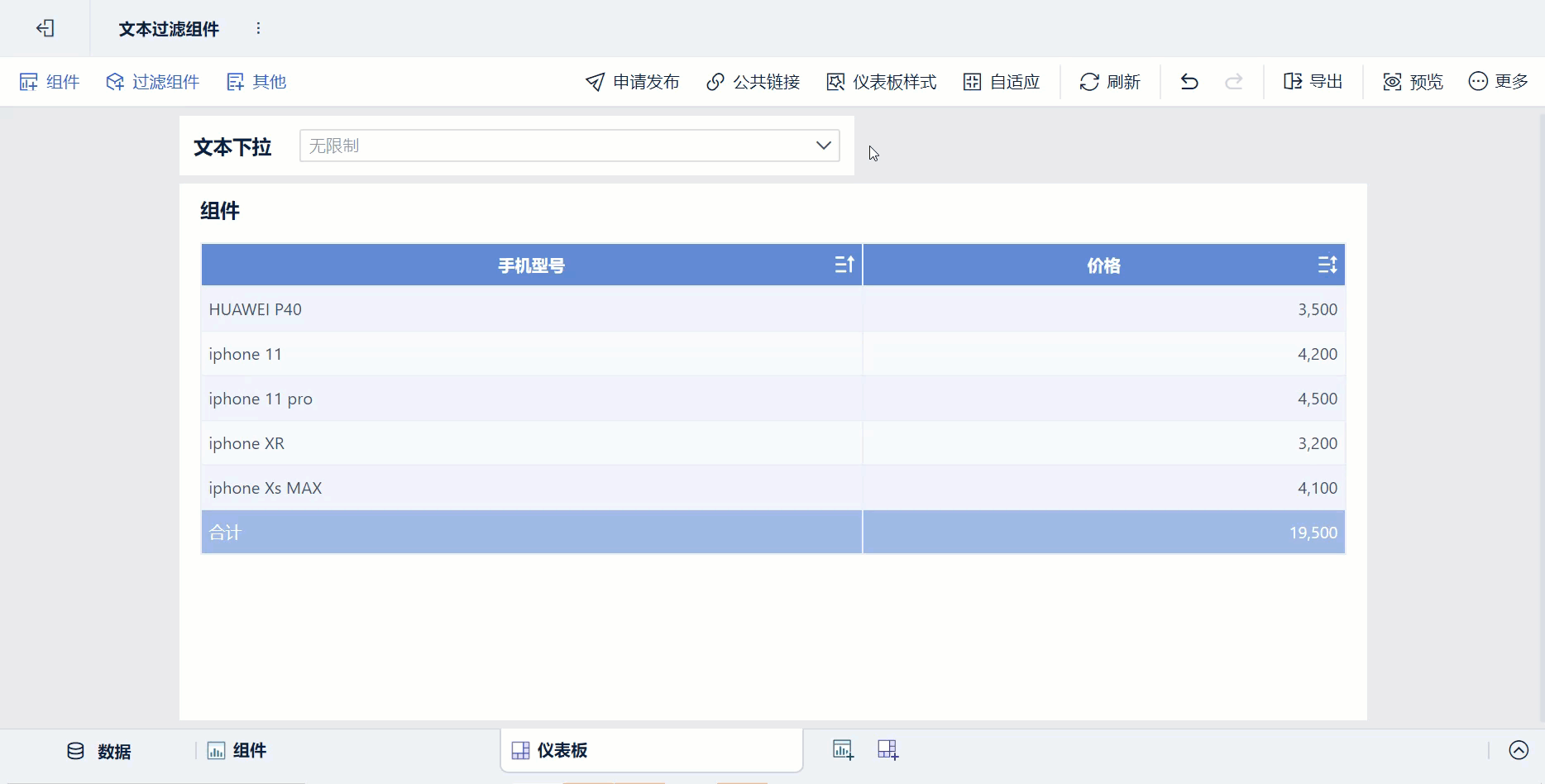 例如:通过文本过滤组件查看「iphone 11」的价格信息。类似这种对文本字段进行筛选的需求,使用文本过滤组件就能轻松实现。