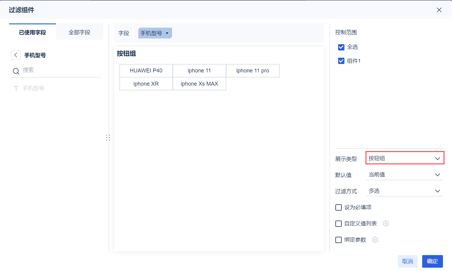 选择对应 组件中的「手机型号」字段,选择「多选」,点击「确定」,如下图所示: