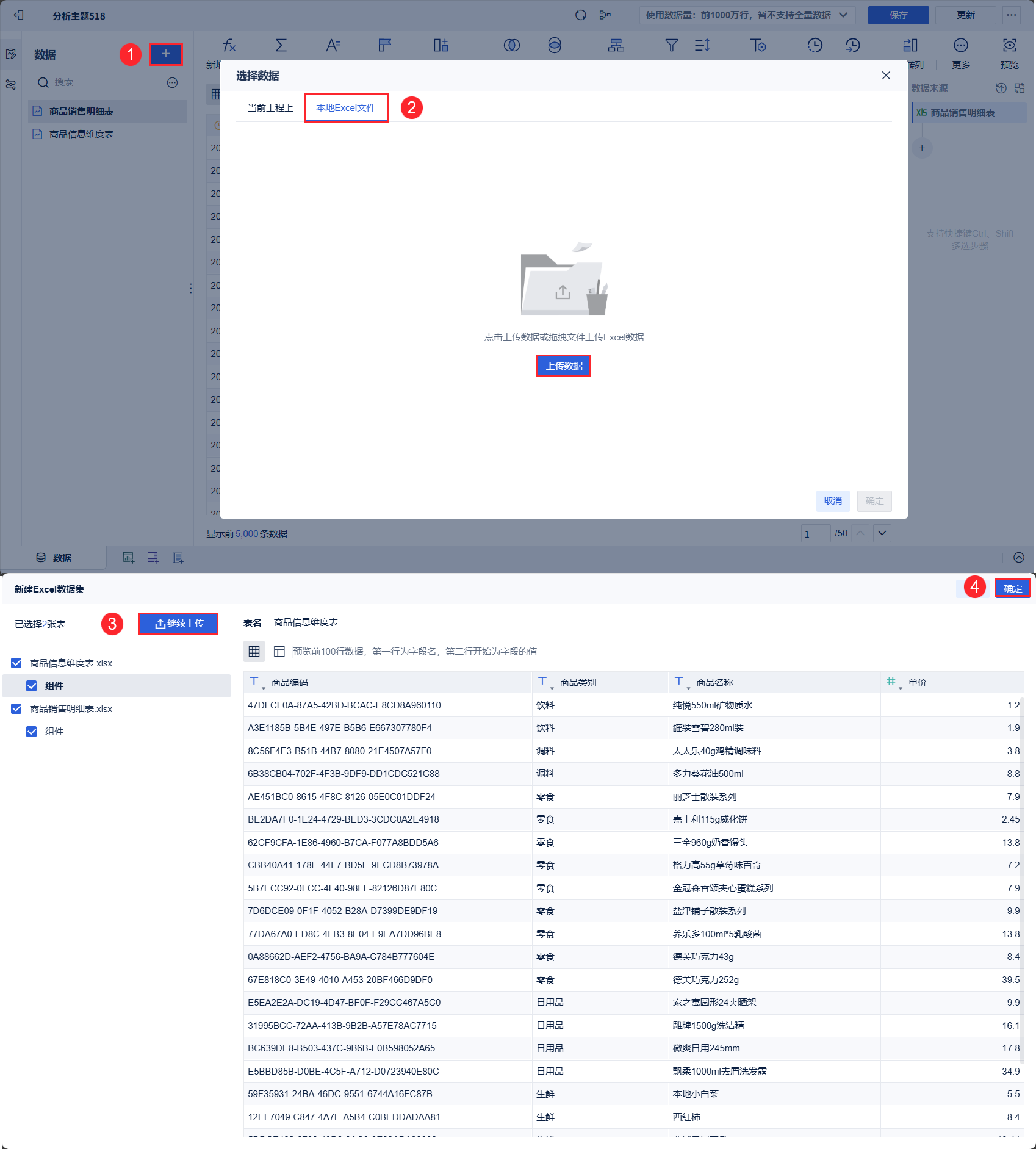 1)新建分析主题,并添加数据。点击「本地Excel文件上传「商品销售明细表」,点击「继续上传」可以继续上传「商品信息维度表」,如下图所示: