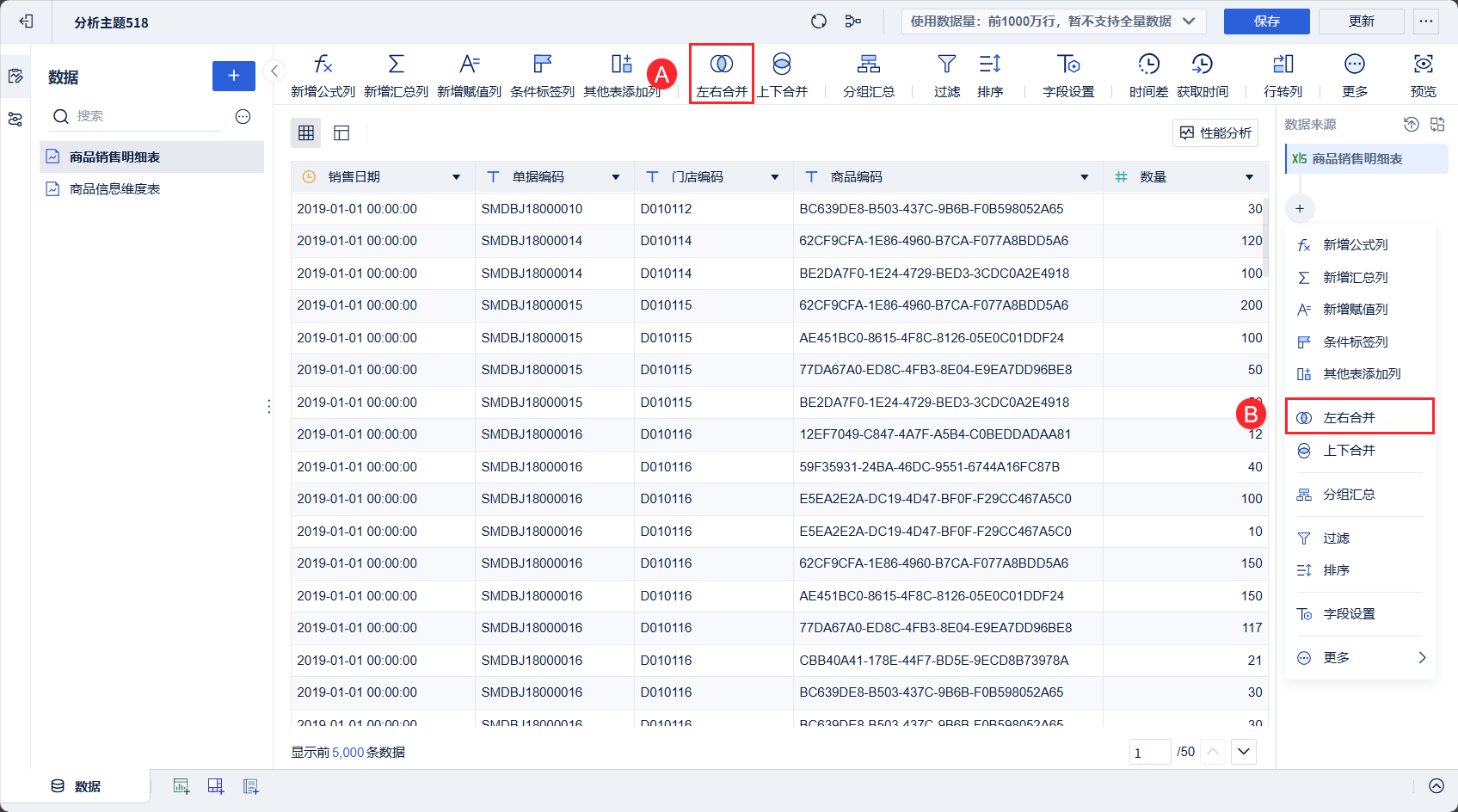 注:建议用户在进行左右合并前,减少表字段名称长度,避免出现字段名称过长导致保存失败问题。
