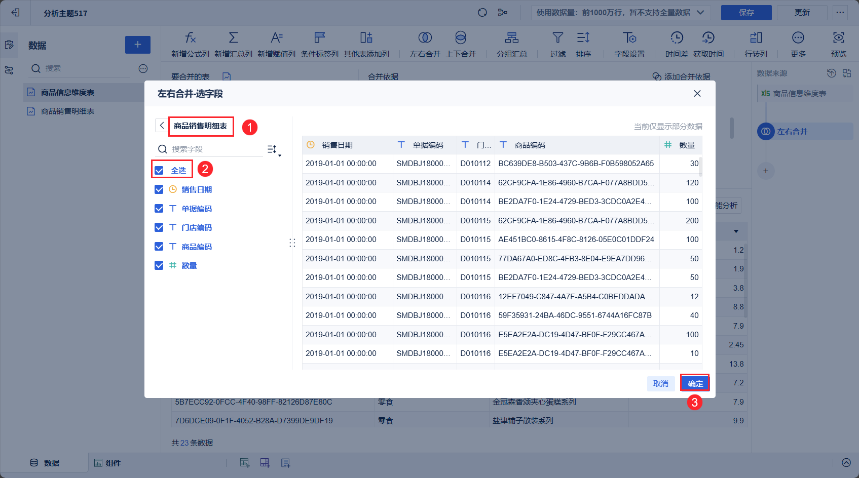 2)选择要左右合并的表「商品信息维度表」,并勾选该表中要参与左右合并的字段。如下图所示:
