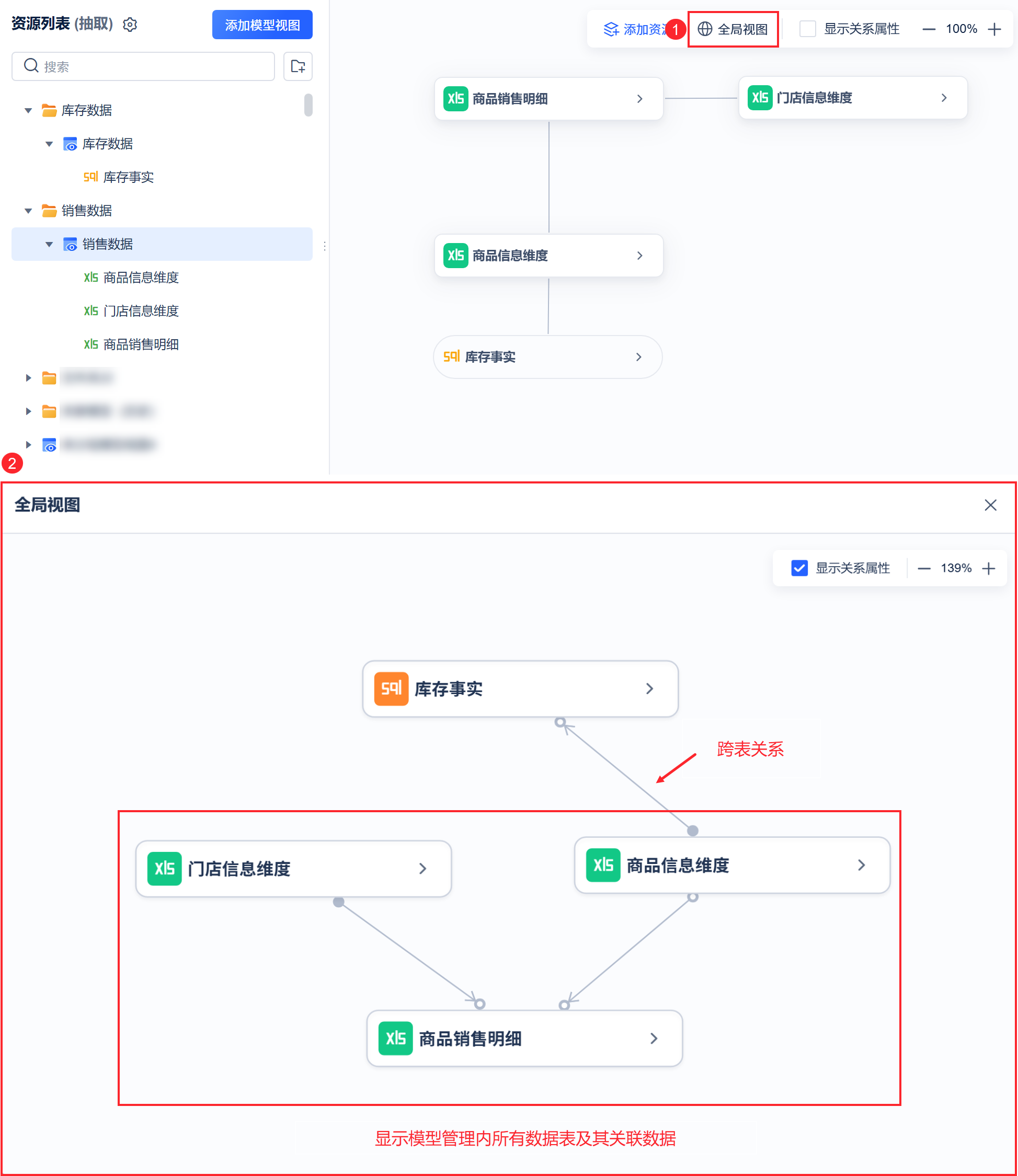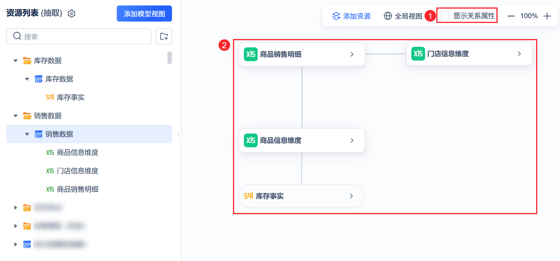 注:用户可点击「添加资源」继续往模型视图添加表。