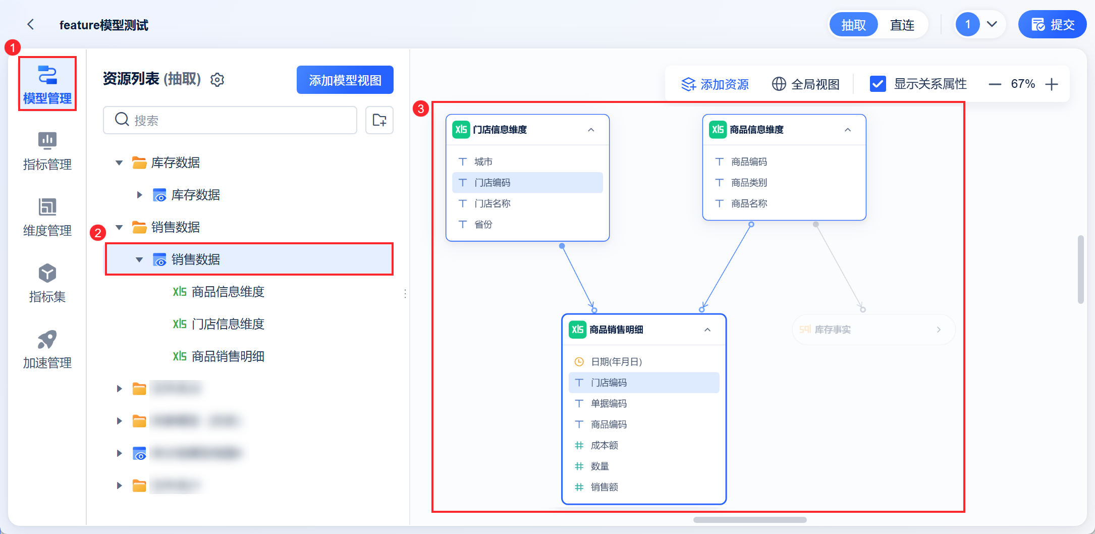 进入「模型管理」编辑页面后,选择要编辑的数据模式。可选「抽取数据/直连数据」。如下图所示: