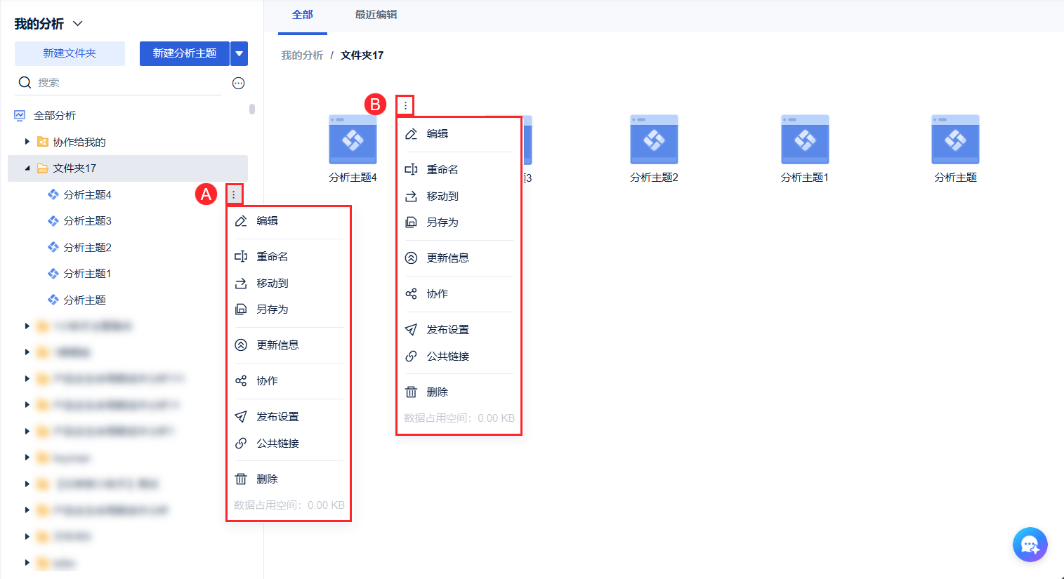 FineBI 支持通过文件夹分门别类的存放分析主题;支持编辑、重命名、移动、批量移动、另存为、删除、批量删除、查找、分享协作分析主题,查看主题更新信息。