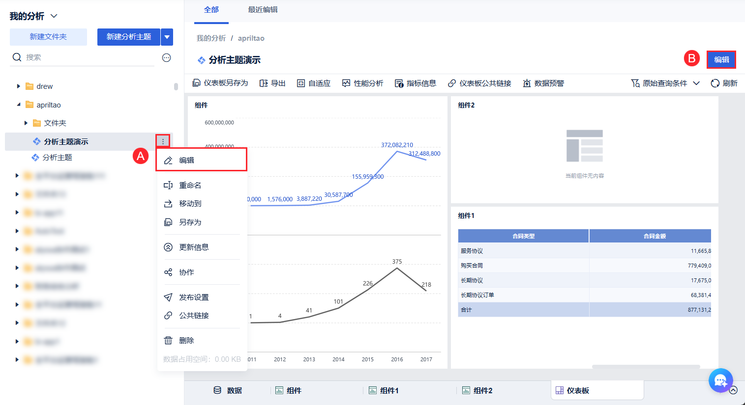 选择分析主题,点击「...>编辑」,也可以点击主题右上角的「编辑」进入编辑界面,如下图所示: