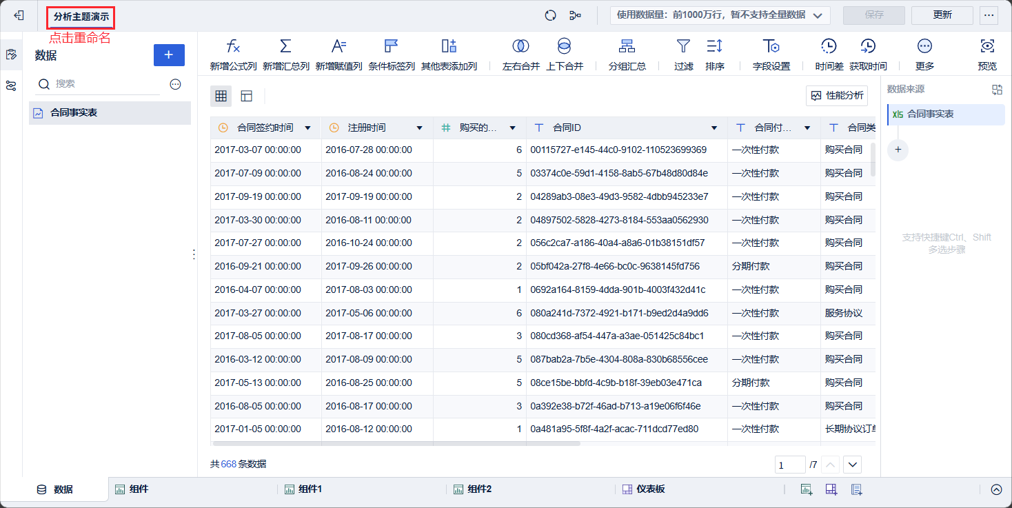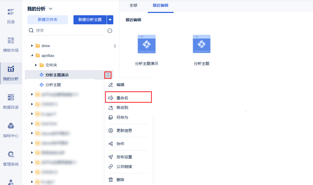 选择「...>重命名」,修改分析主题名称,如下图所示: