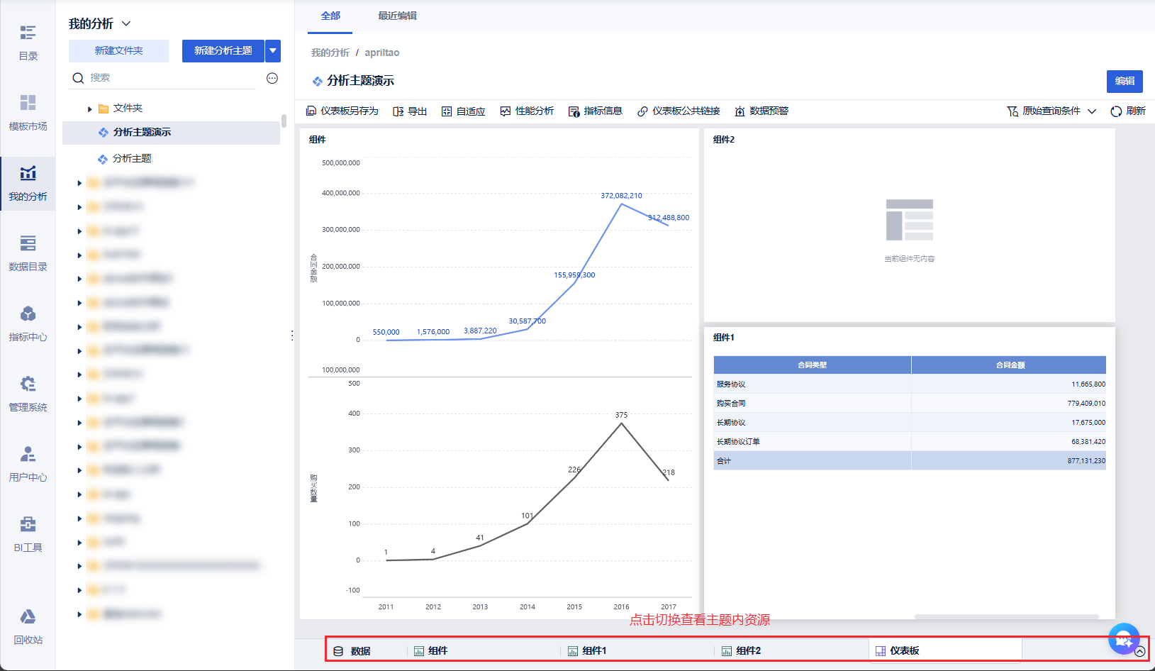 切换底部的 tab 可以查看该分析主题的数据、组件、仪表板、分析文档,如下图所示: