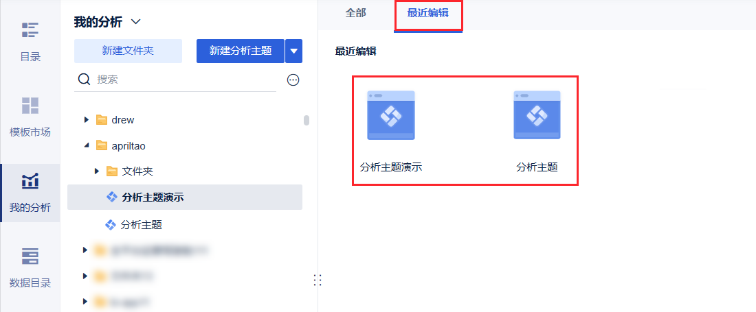 在我的分析右侧,点击「最近编辑」,可以看到最近编辑的一些分析主题,也包括最近编辑的别人协作给当前用户的分析主题,如下图所示: