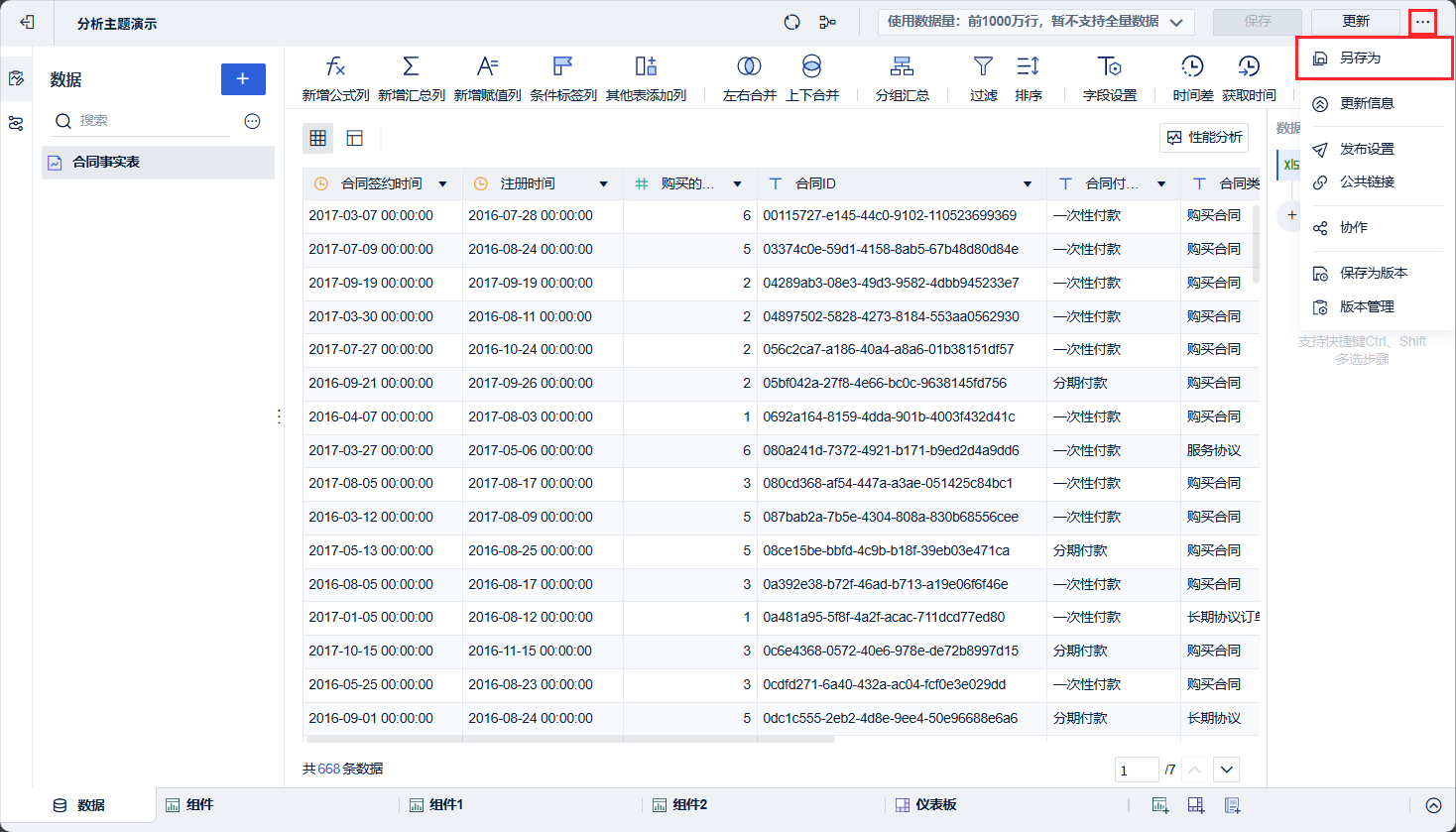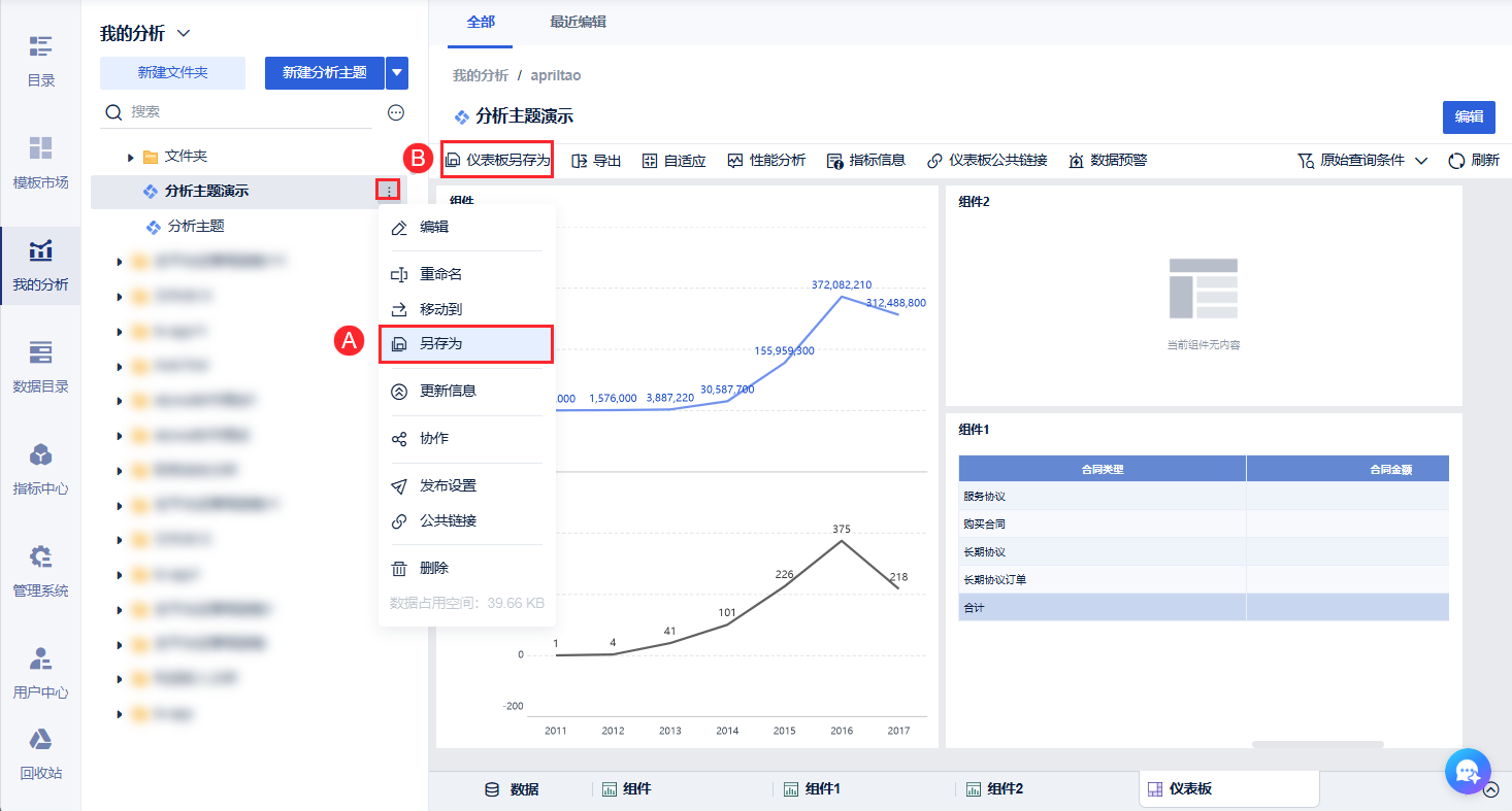 点击「...>另存为」,或者预览主题时点击「另存为分析主题」。设置另存的主题名称和存放位置,点击「确定」,另存后自动打开分析主题编辑界面,如下图所示: